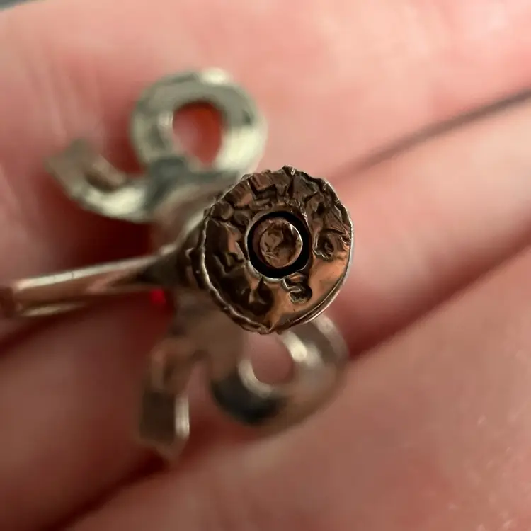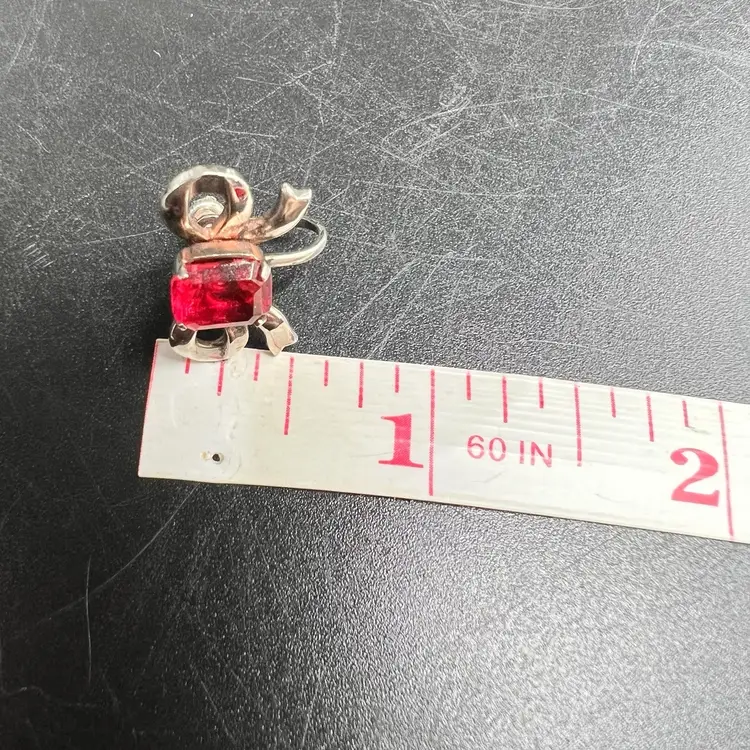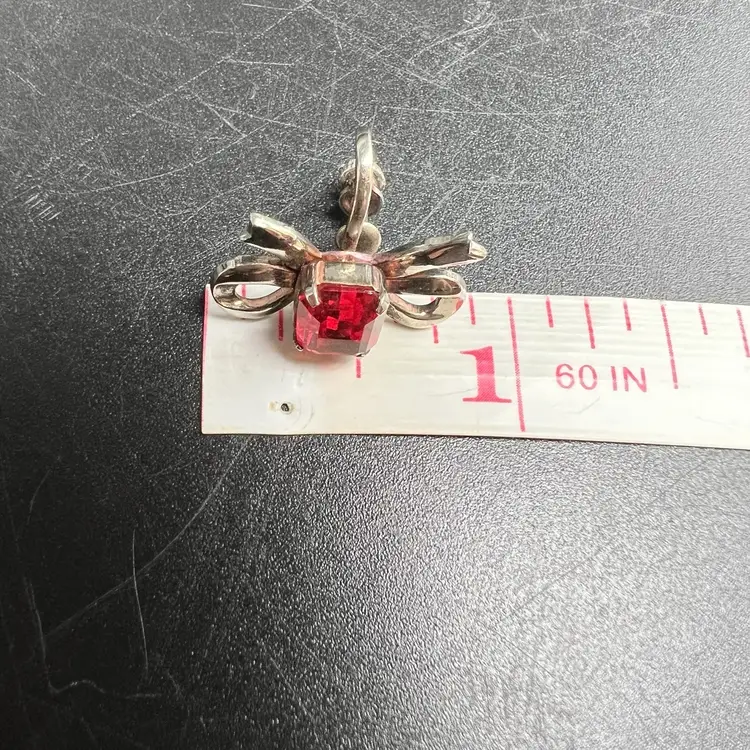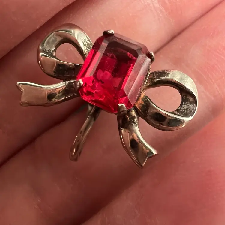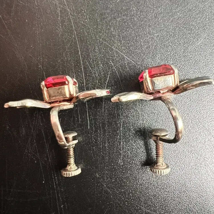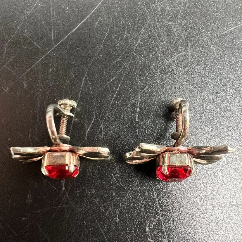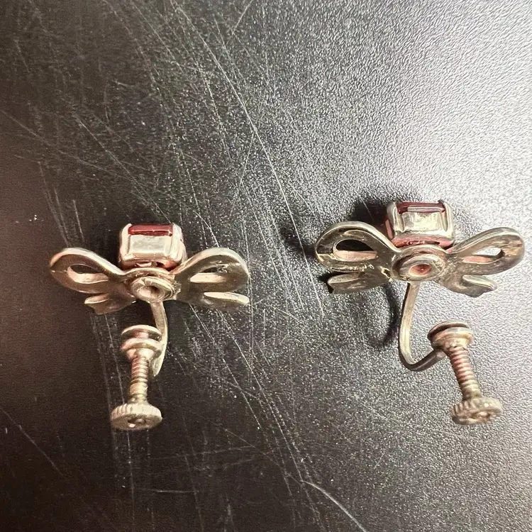 Elevate your jewelry collection with the timeless elegance of these 1940s sterling silver prong-set red glass bow-shaped screw-back earrings. The exquisite emerald-cut red glass stones add a touch of vintage glamour, while the intricate bow design offers a charming retro flair. Crafted with precision, these earrings embody the art and beauty of the era, making them a versatile addition to any outfit, from casual daytime wear to formal evening attire.