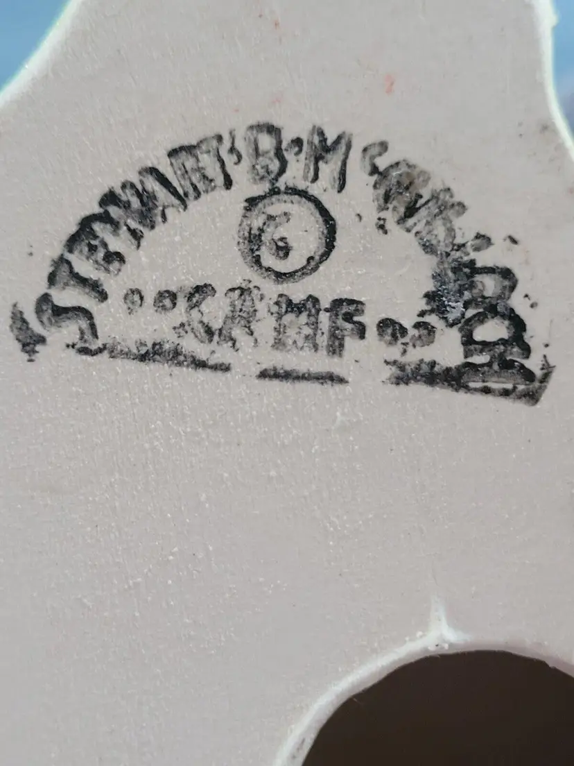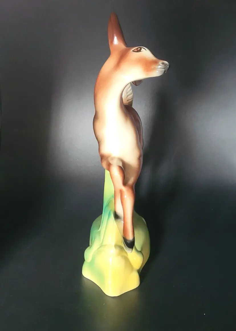 This vintage Stewart McCulloch ceramic figurine depicts a leaping deer in shades of brown, green, yellow, and cream. Handmade in the mid-20th century, the figurine measures 7" in length, 9.75" in height, and features a 4.5" x 2.5" base. The item is an original, part of the Animals collection, and perfect for decorative collectibles. The deer figurine is a beautiful addition to any space and is a must-have for collectors of mid-century figurines