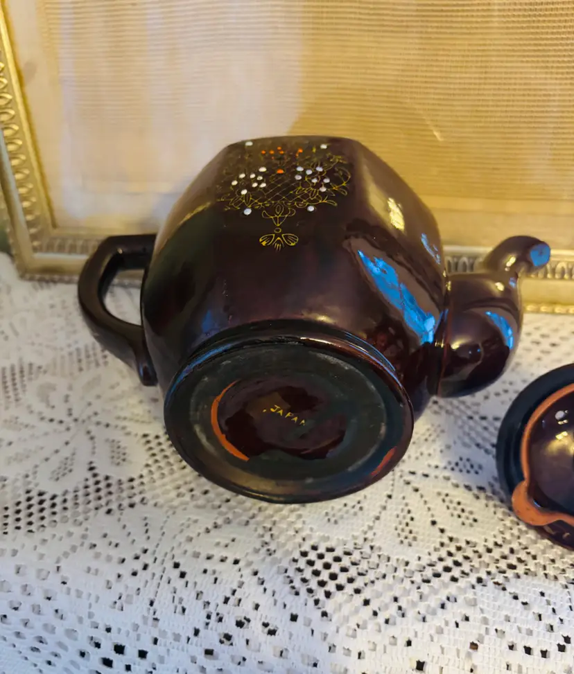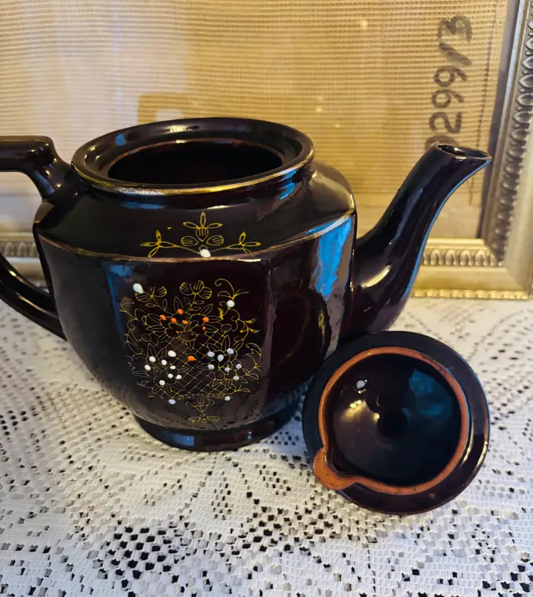 This teapot is hand-painted in the Japanese Moriage style. with orange and white raised dots, In excellent vintage condition. 6" tall 4.5 " diameter