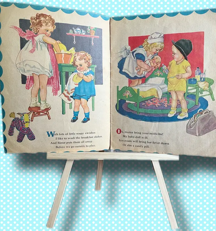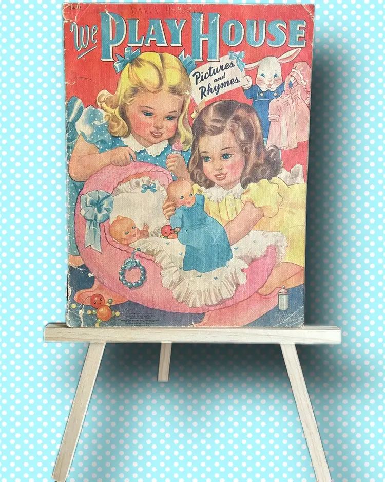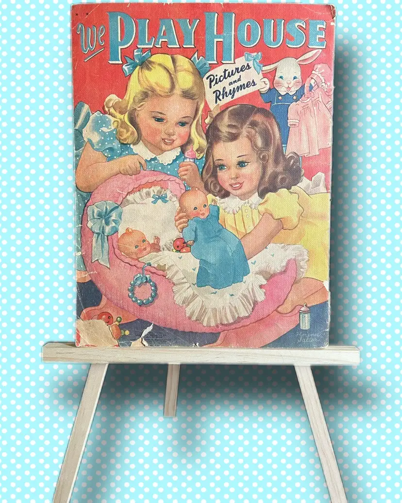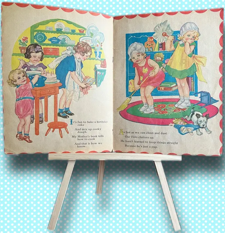 1942 Published by Merrill Linen-like texture pages Measures 13x9.75 Every page has amazing graphics!! I didnt photograph every page. Used condition- please look at photos. Some bending at edges. Back cover has tear in bottom left corner- as photographed Name written at top of cover page.