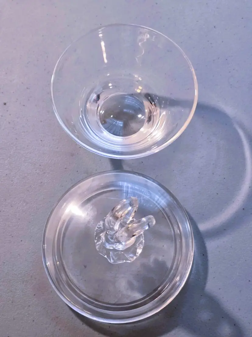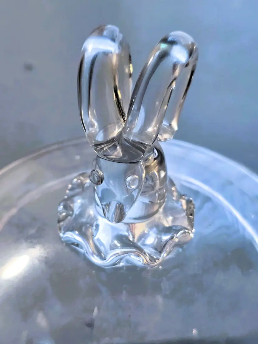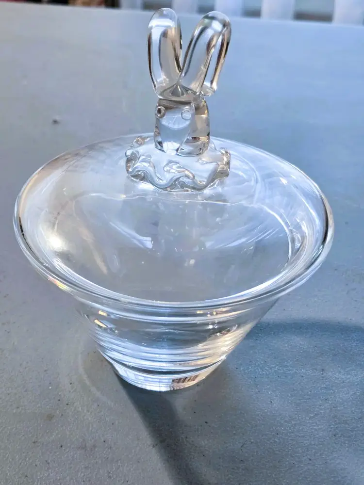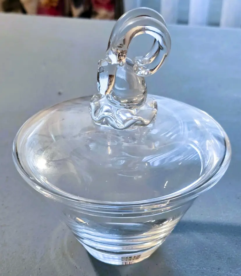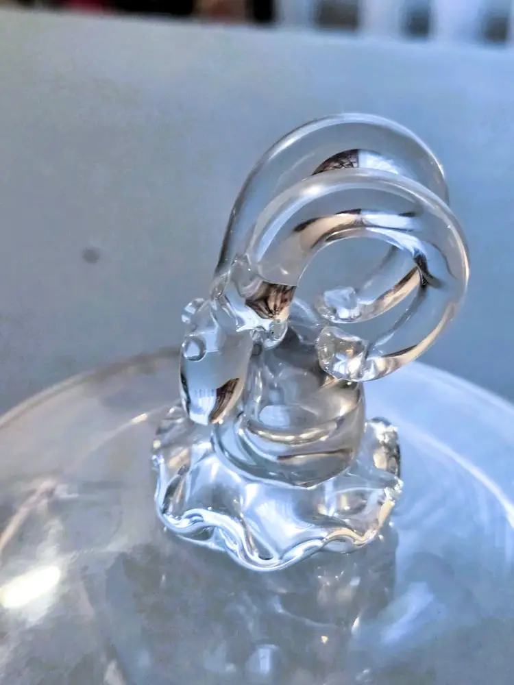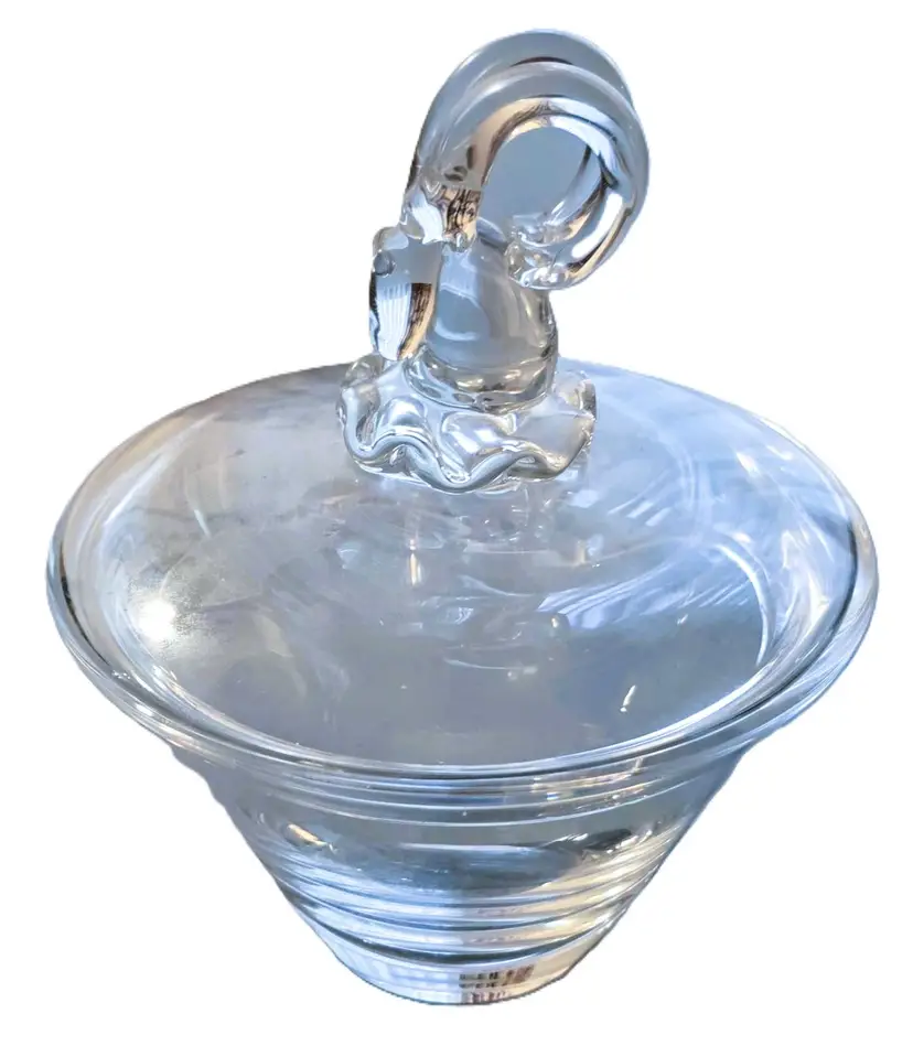 The dish features a beautifully crafted ram's head finial design and is made of high-quality, hand-blown glass. The clear color and ram's head lid make it a unique addition to any collection. This unusual Steuben Glass design was created by Irene Benton in 1943. It measures 7" high with a top diameter of 5". It is acid etched and signed "Steuben" along the bottom edge. Came from a Long Island estate.