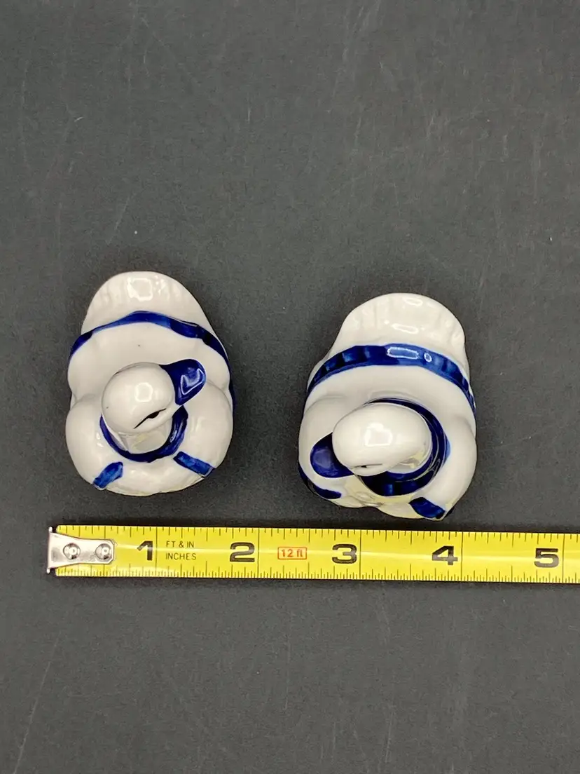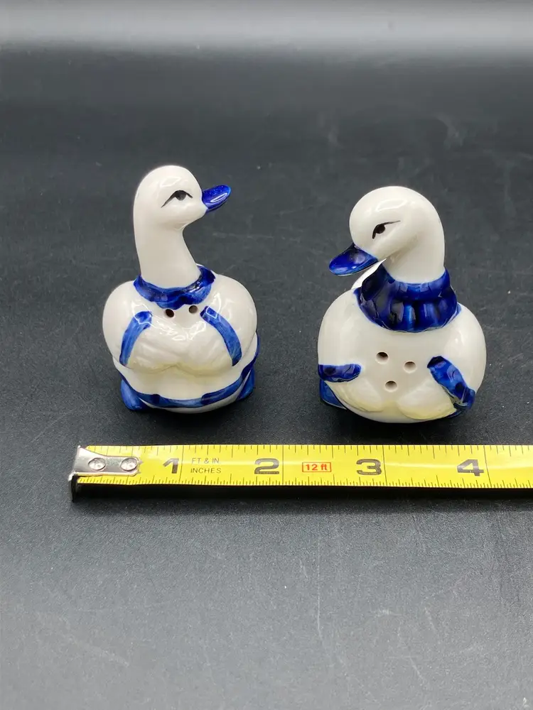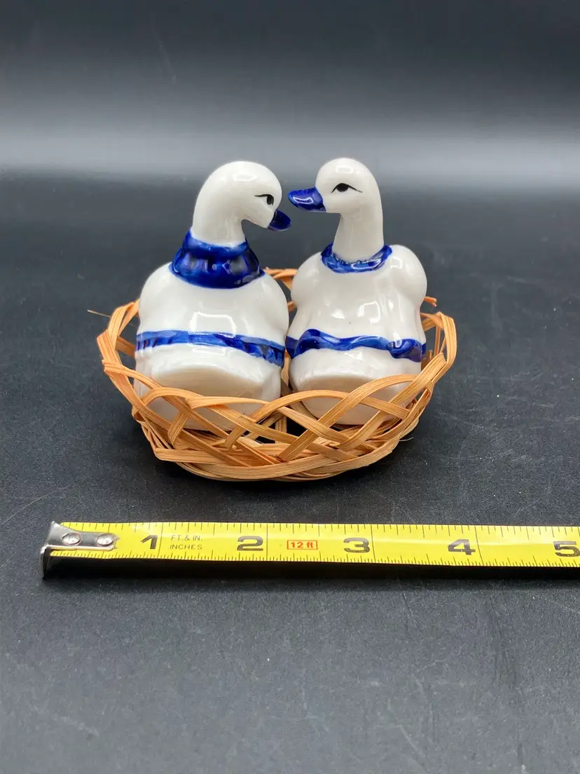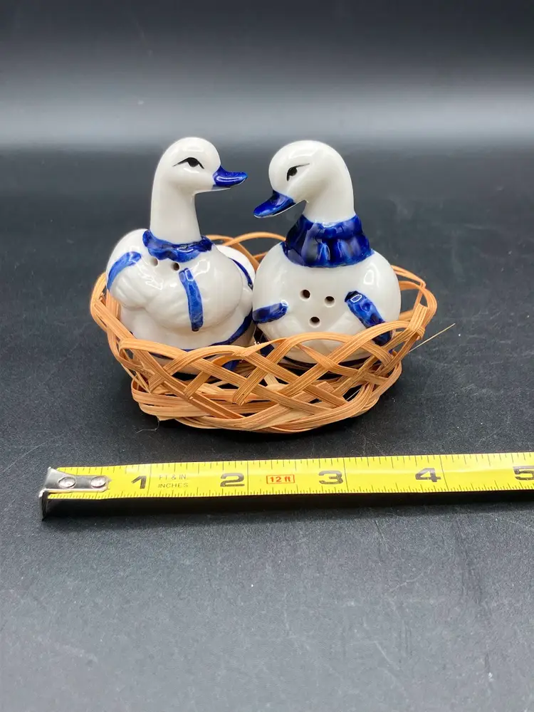 Geese shakers in basket. Basket has a condition issue. Shakers have no chips or cracks. Please see pictures for complete description, measurements and condition.