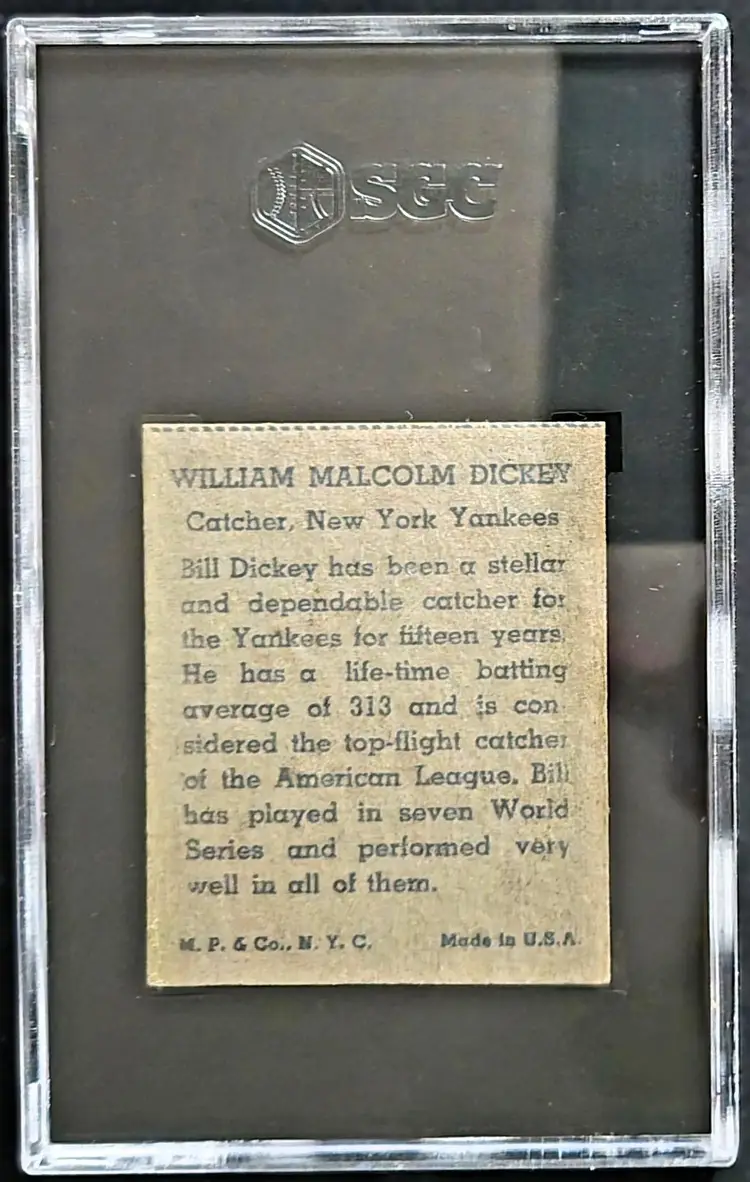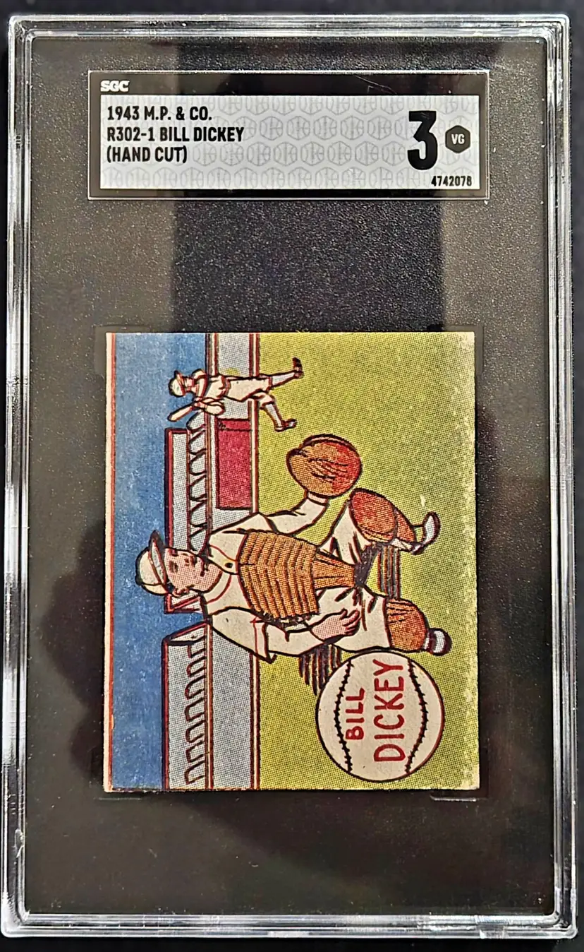 1943 R302-1 M.P. & Co. Bill Dickey baseball card, graded SGC 3 (Very Good). This wartime-era issue is part of a scarce and unique set produced by the Michael Pressner Company. Featuring Hall of Fame catcher Bill Dickey, this card remains a key piece for vintage collectors and Yankees fans alike.