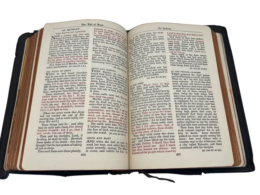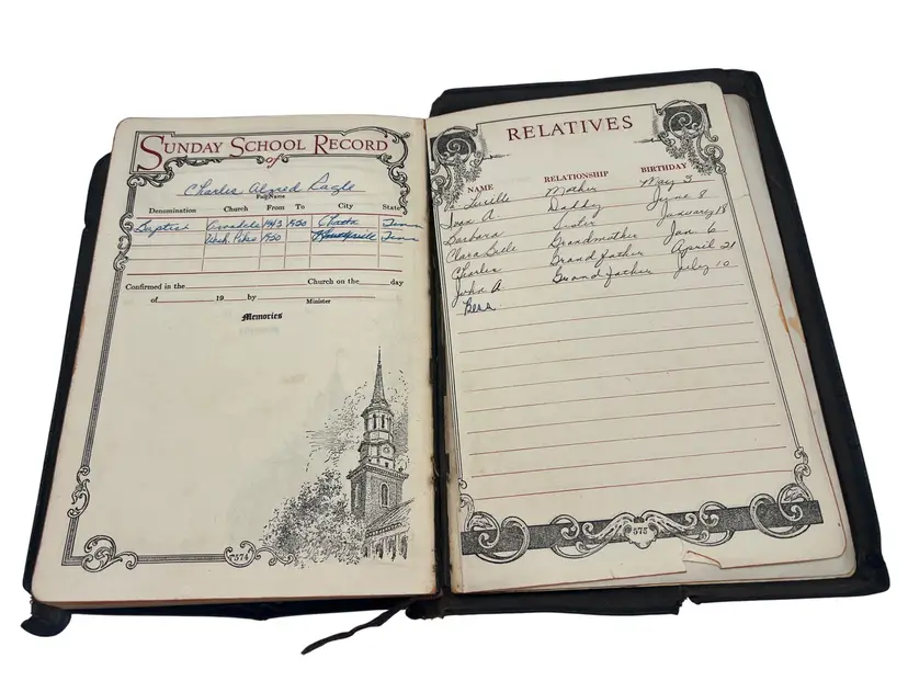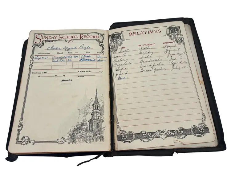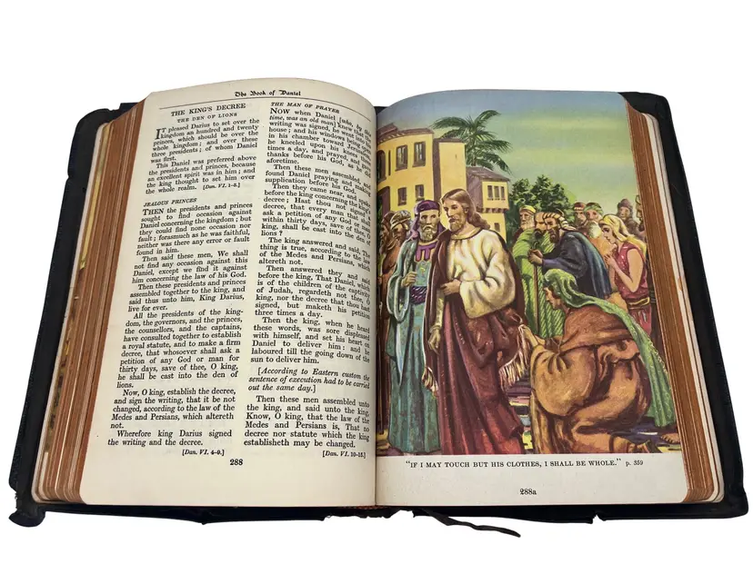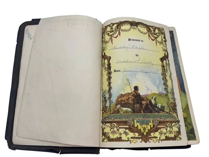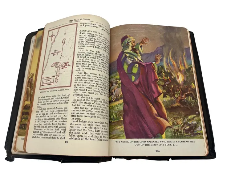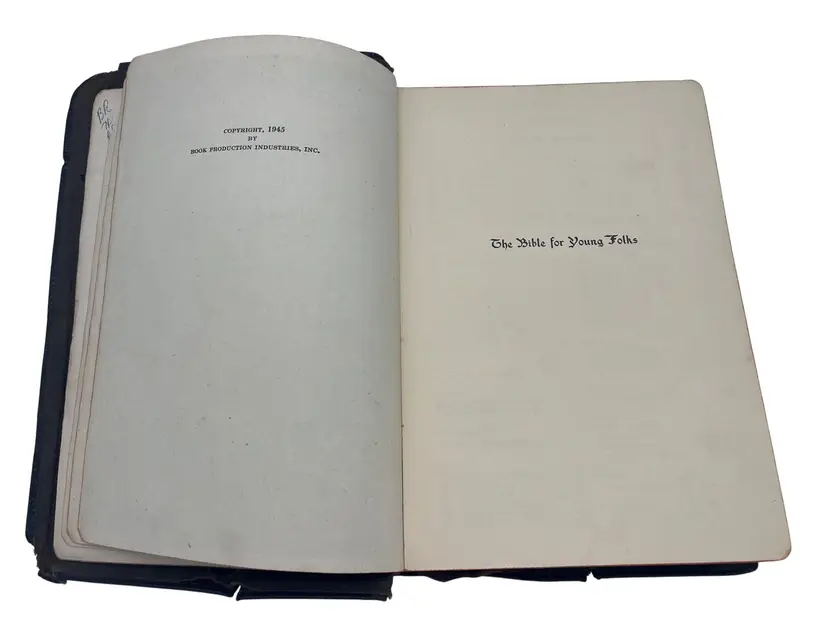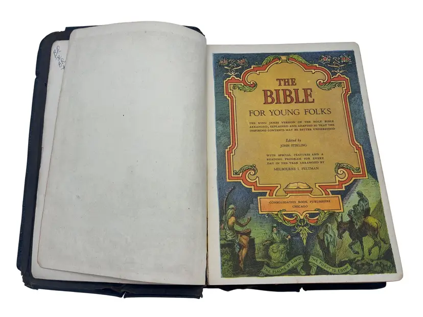 1945 edition of The Bible for Young Folks edited by John Stirling and published by Consolidated Book Publishers. This version of the King James Bible was arranged and adapted for younger readers with explanations and vivid color illustrations throughout. Includes a reading program by Melbourne I. Feltman. Leather-bound with gold gilt text on the cover, measuring approximately 8.5" x 6". Includes Sunday School records, inscriptions, and family notes dated June 12, 1946.