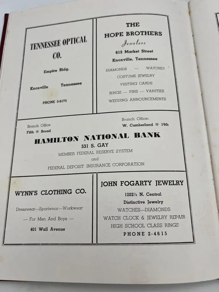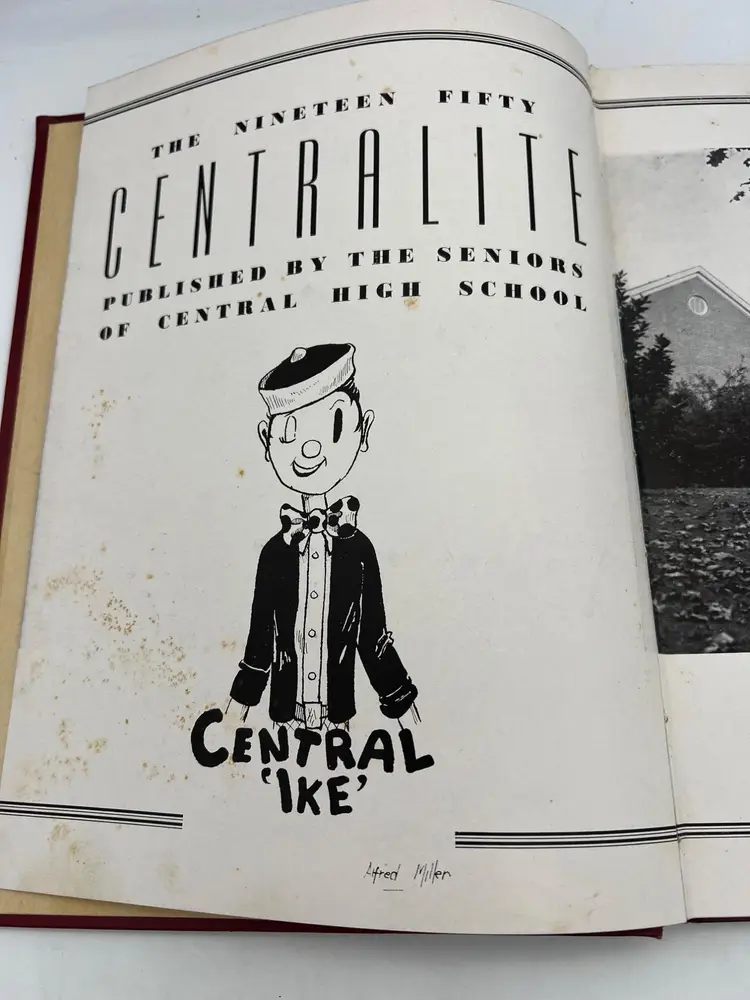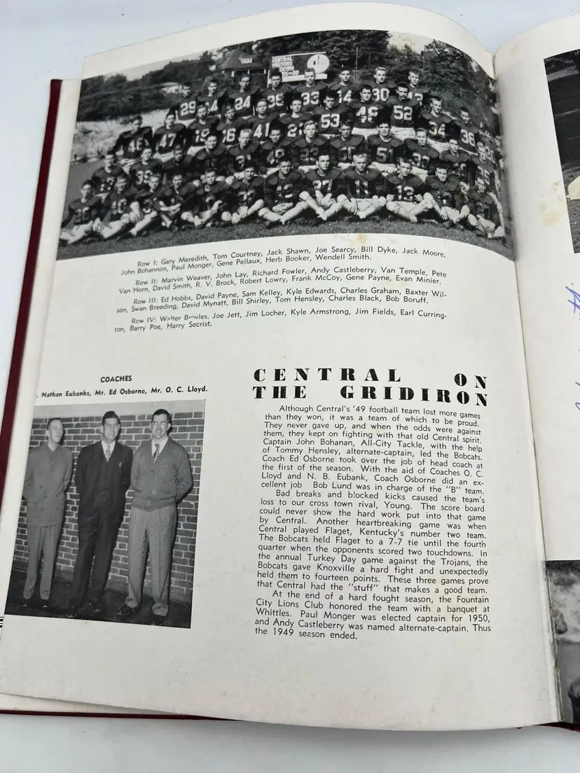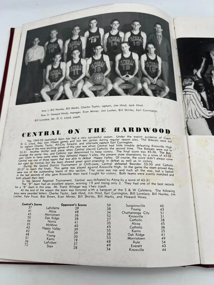 A vintage yearbook from Central High School in Knoxville, Tennessee, dated 1950, featuring photographs, stories, ads, and handwritten messages from students.