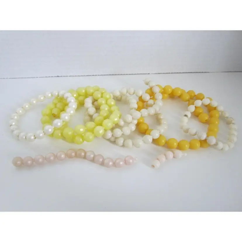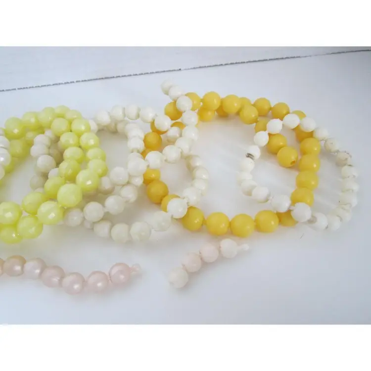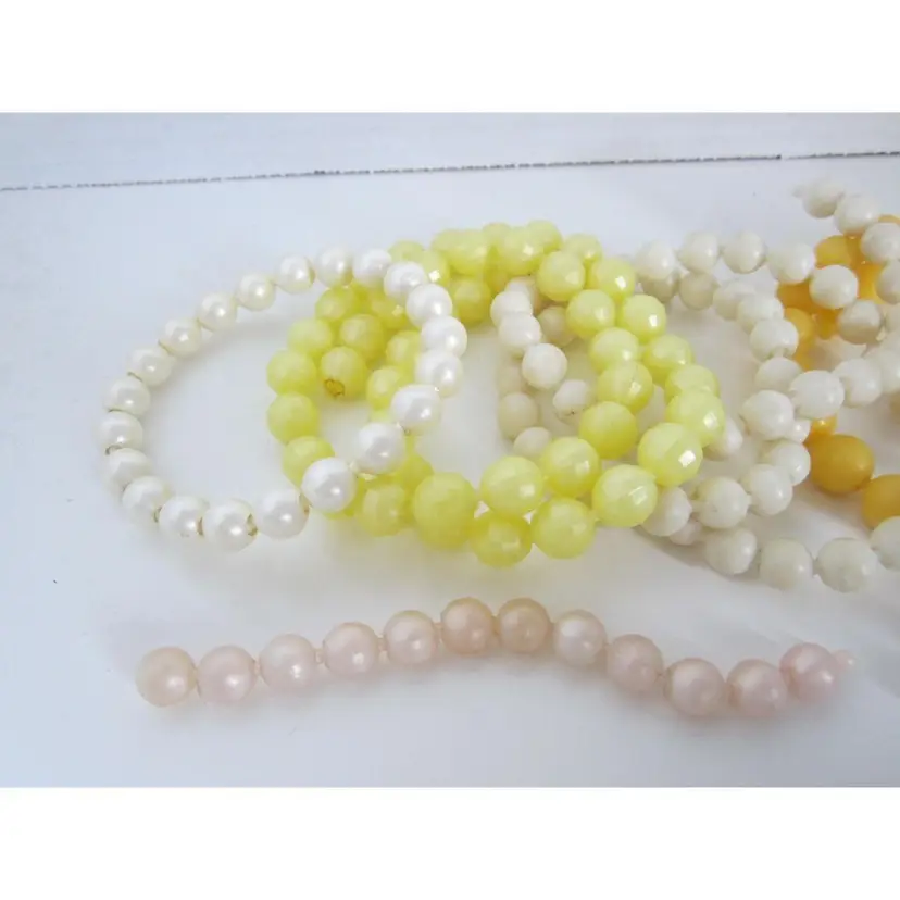 1950's POP BEADS. There are 176 in total. There are smooth orange ones, faceted yellow and assorted tones of ivory. The sizes range from 1/3" to 1/2" diameter. All are in good condition.