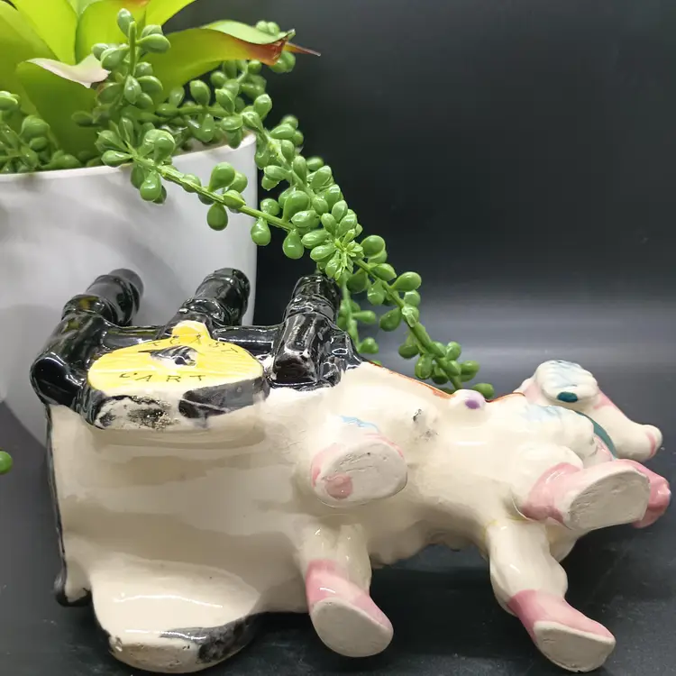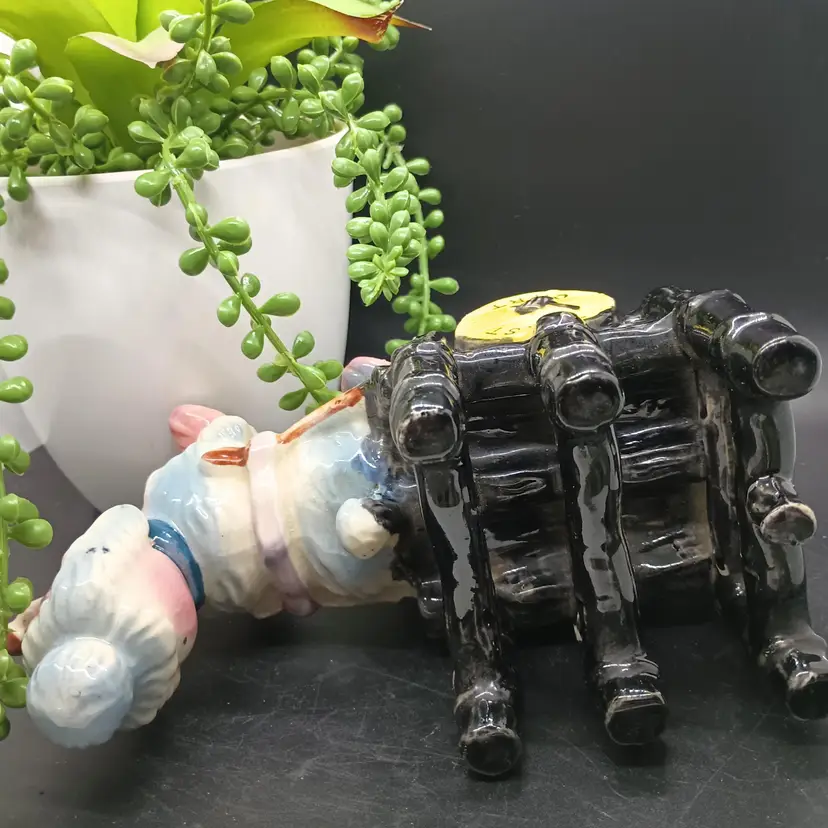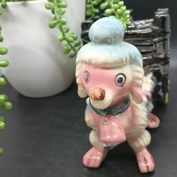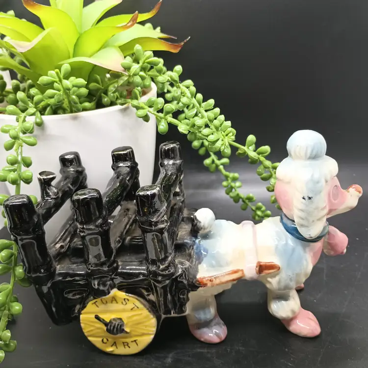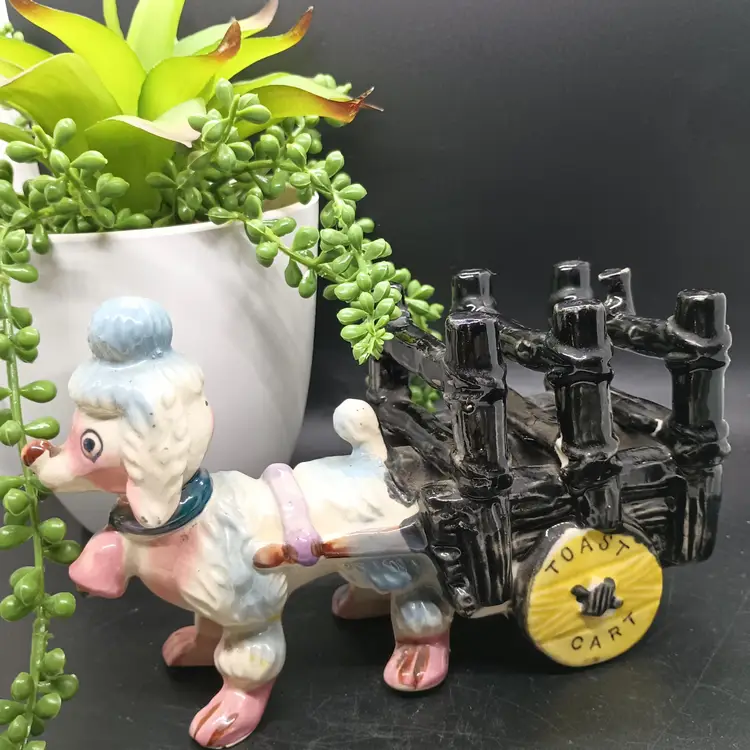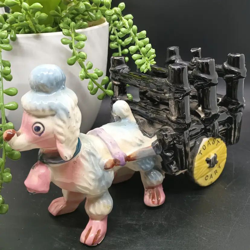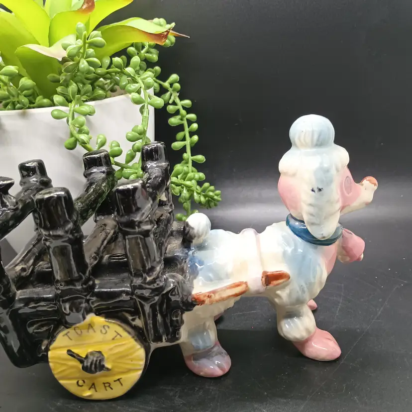 Blue and pink poodle pulling a black two-wheeled cart. The Yellow Wheels on the cart have "TOAST CART" spelled out in black. This figurine has some crazing as well as rub to the paint but is in overall good condition with no chips or cracks. Please see photos for detail. This piece measures approximately 8-1/4"L x 3-1/2"W x 5"H