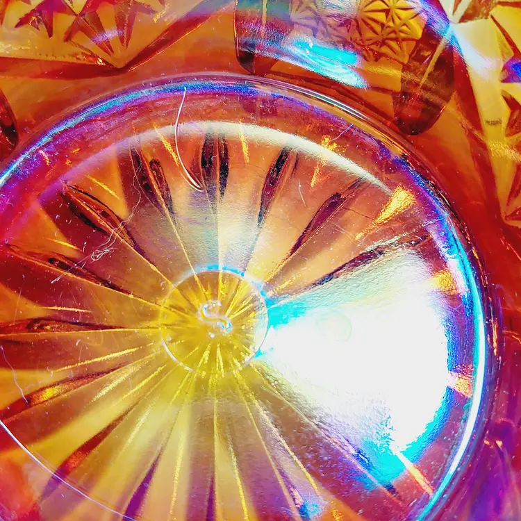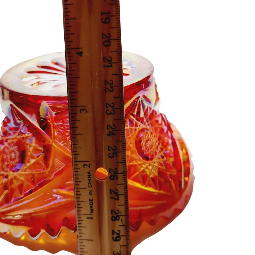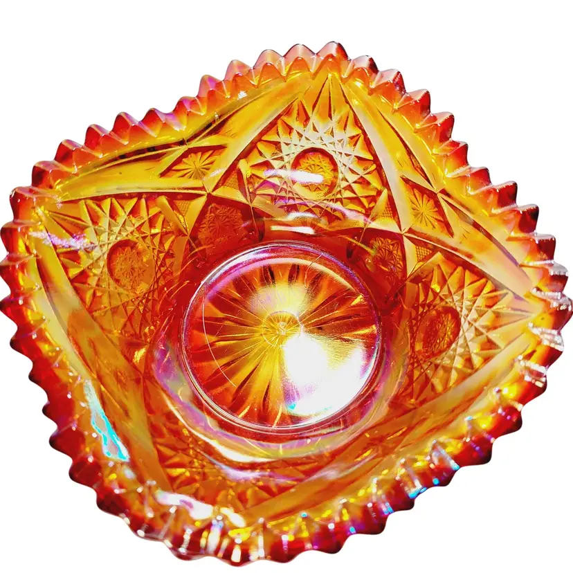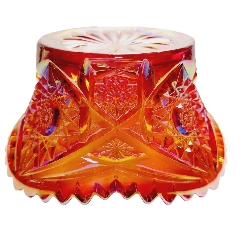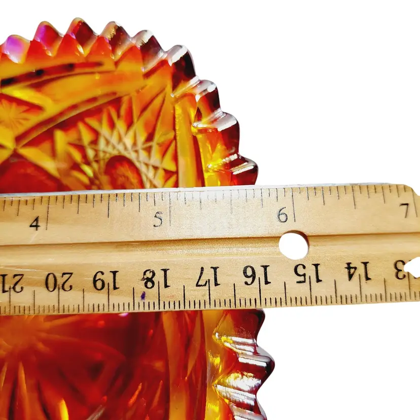 This exquisite vintage bowl, crafted in the 1950s, features a vibrant honey amber carnival glass finish. The intricate hobstar pattern and sawtooth edge reflect an era of elegance and skilled craftsmanship. Its radiant iridescence and unique design make it a striking centerpiece or collectible item that embodies vintage charm.