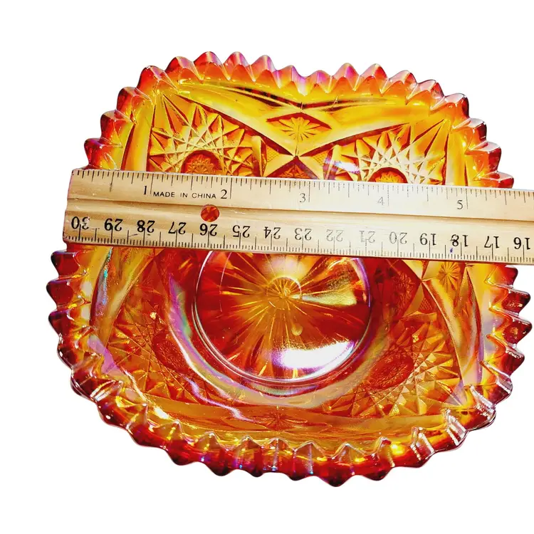 • Hobstar pattern adds intricate detail • Sawtooth edge for a decorative finish • Radiant iridescent glow • Durable and heavy glass • Unique design enhances decor