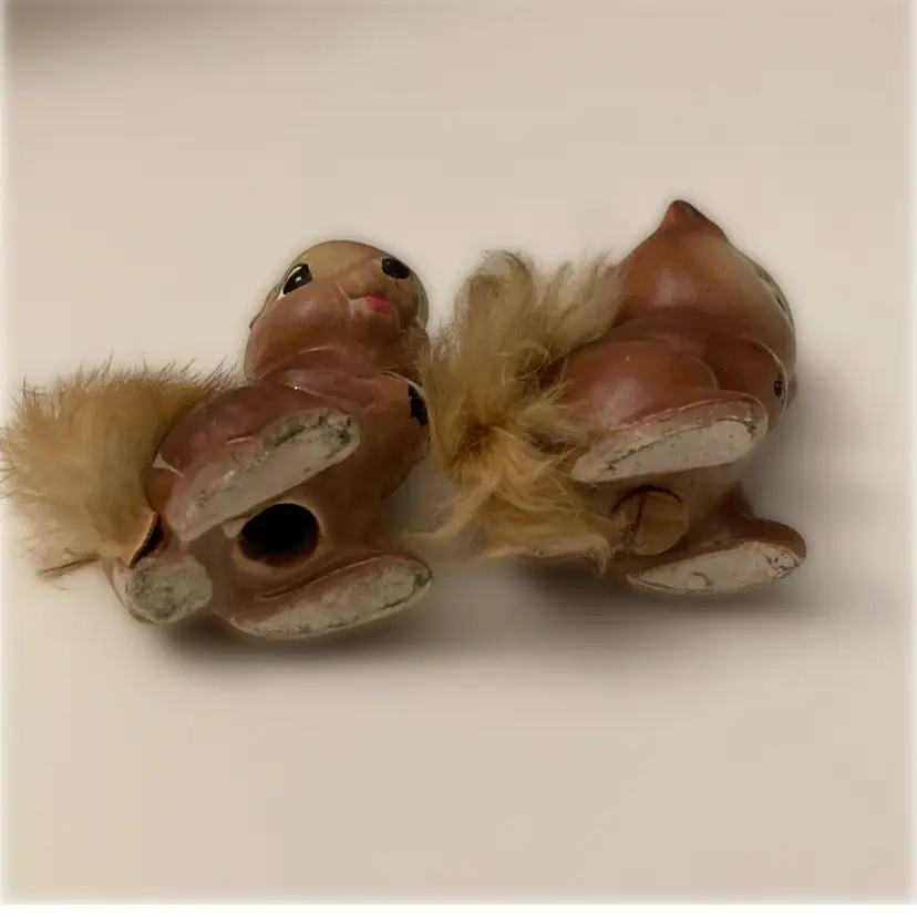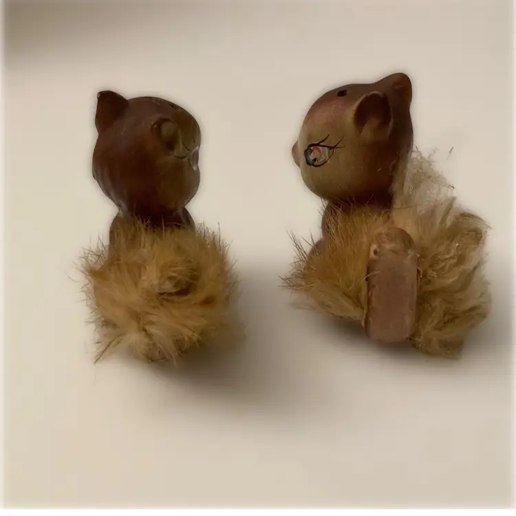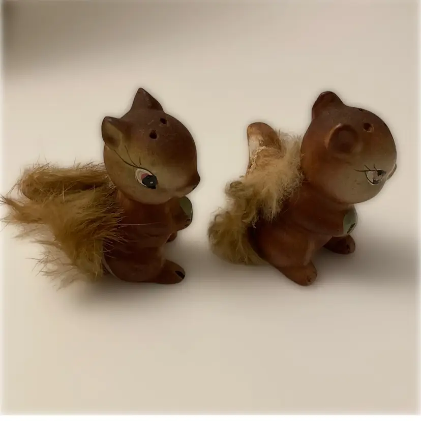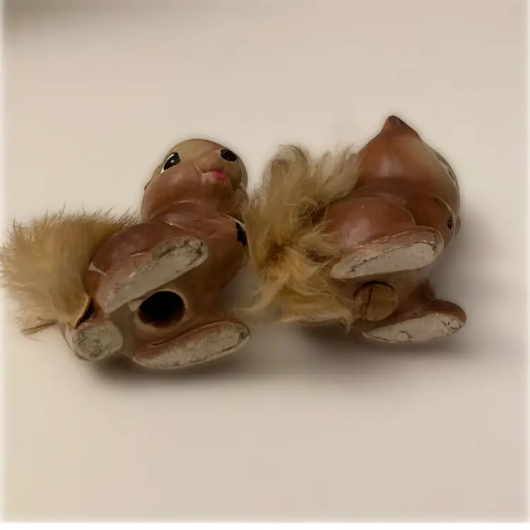 1950’s Enesco Chappie tye Chipmunk salt & pepper shakers. There is some loss of the fur on ones tail. Some cold paint loss to salt. Pepoer is missing his stopper.