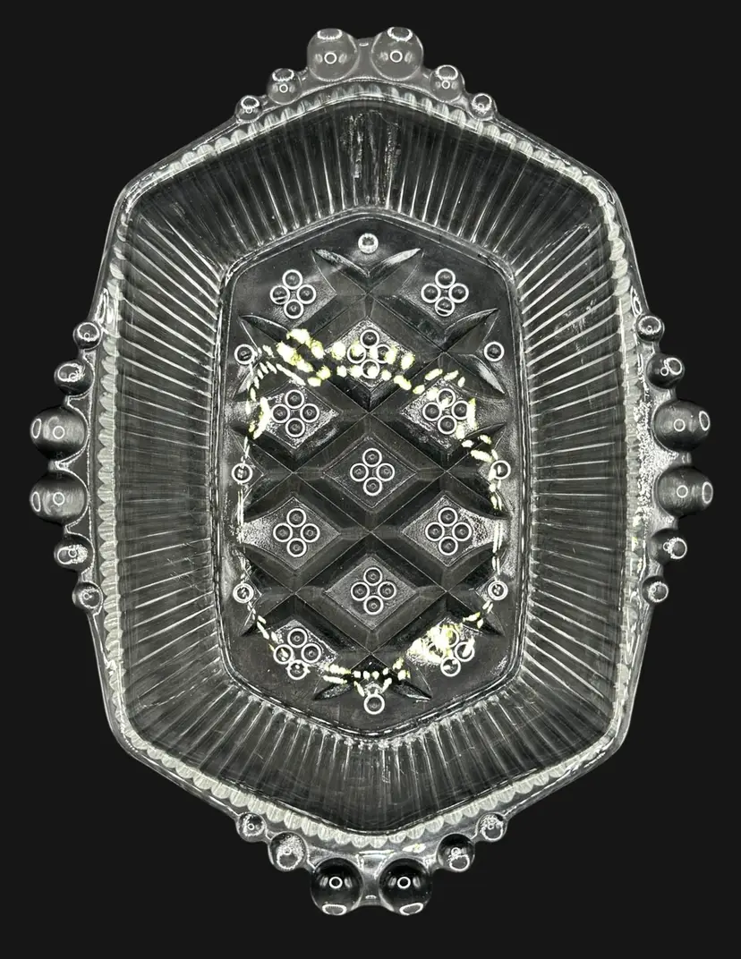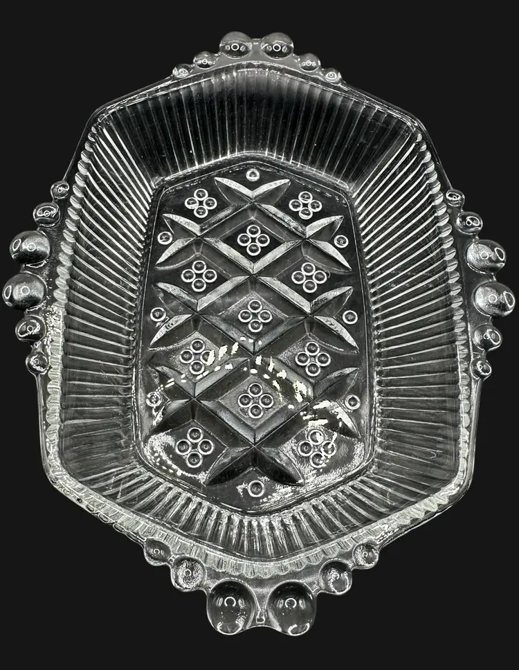 Pretty vintage Bon Bon dish (candy dish) from Anchor Hocking. Excellent condition, no chips or cracks. Measures 7.25” long and 5.5” wide.