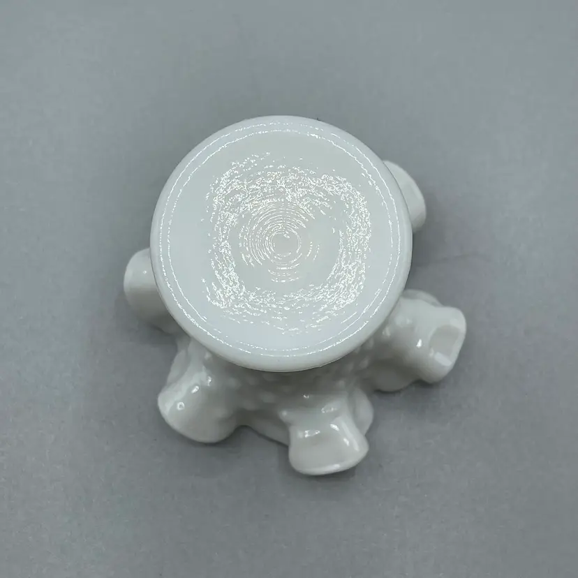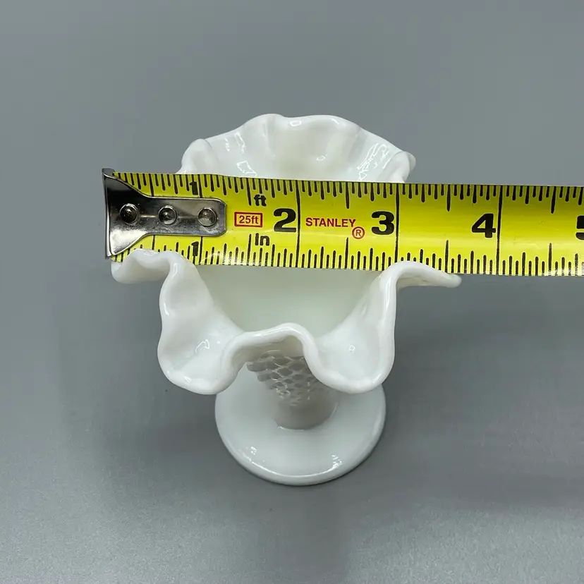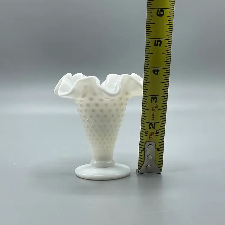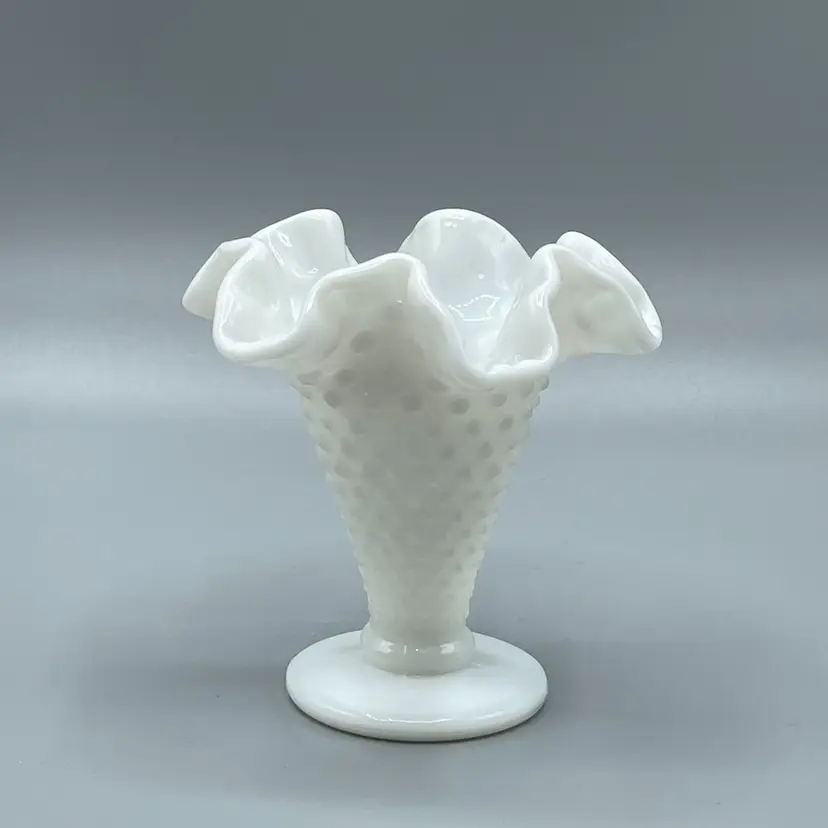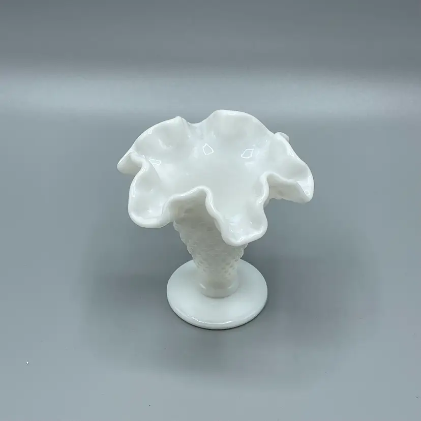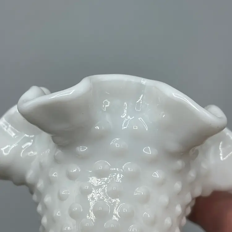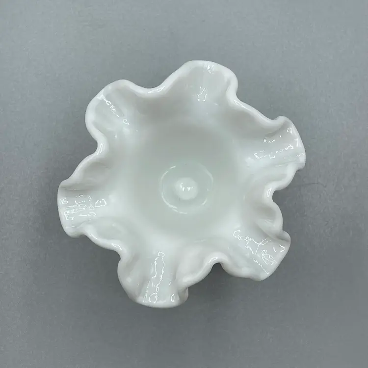 No chips or cracks. Unmarked. Some color variation in the glass around the ruffled edge as expected with the older formulation of milk glass produced by Fenton prior to the 1960s.