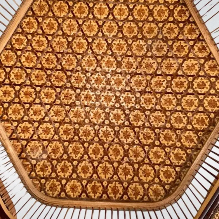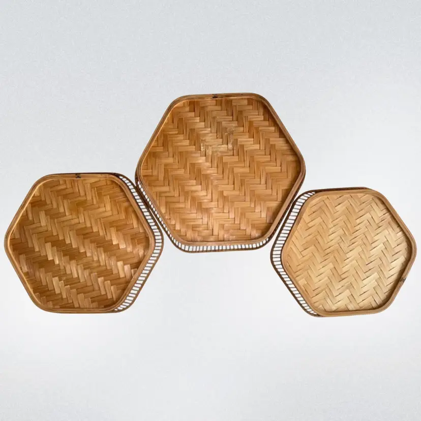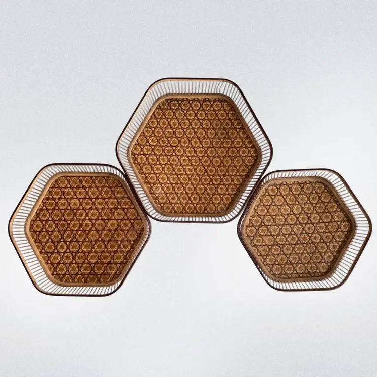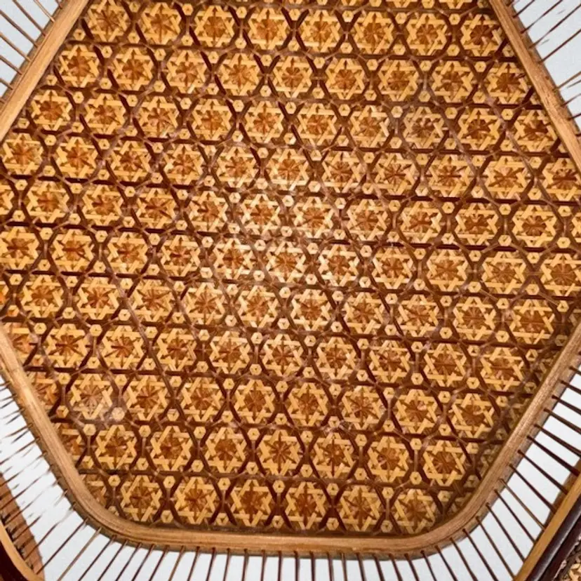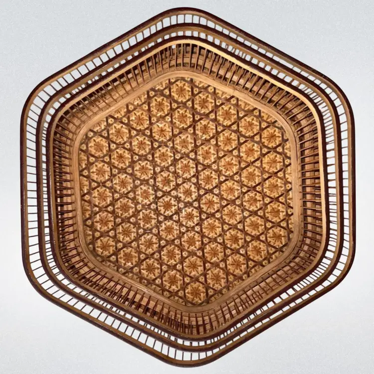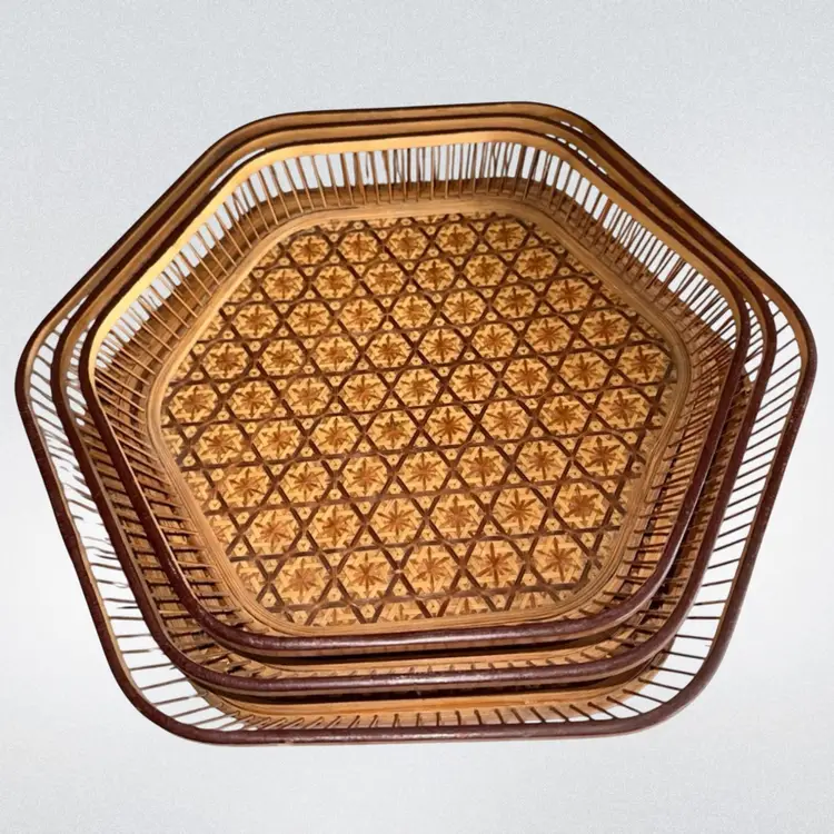 1950s Japanese Woven Hexagon Bamboo Sweet Tray Wall Baskets Set Of 3 Great condition! Add hangers to the back or use laying down. Smallest measures 9 1/2” x 8 1/2” Middle one measures almost 10 1/4” x 9 1/2” Largest measures almost 11 1/2 inches by almost 10 1/4 inches