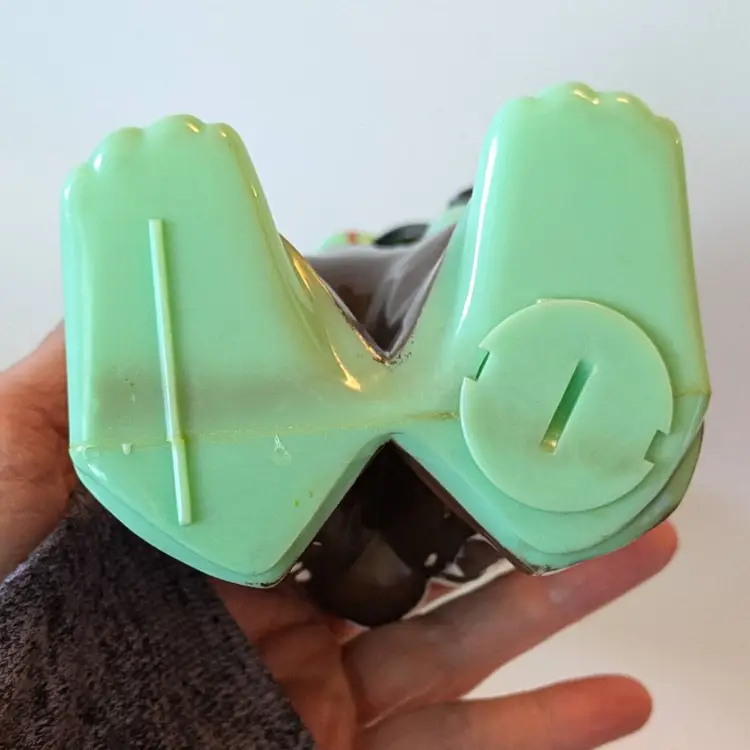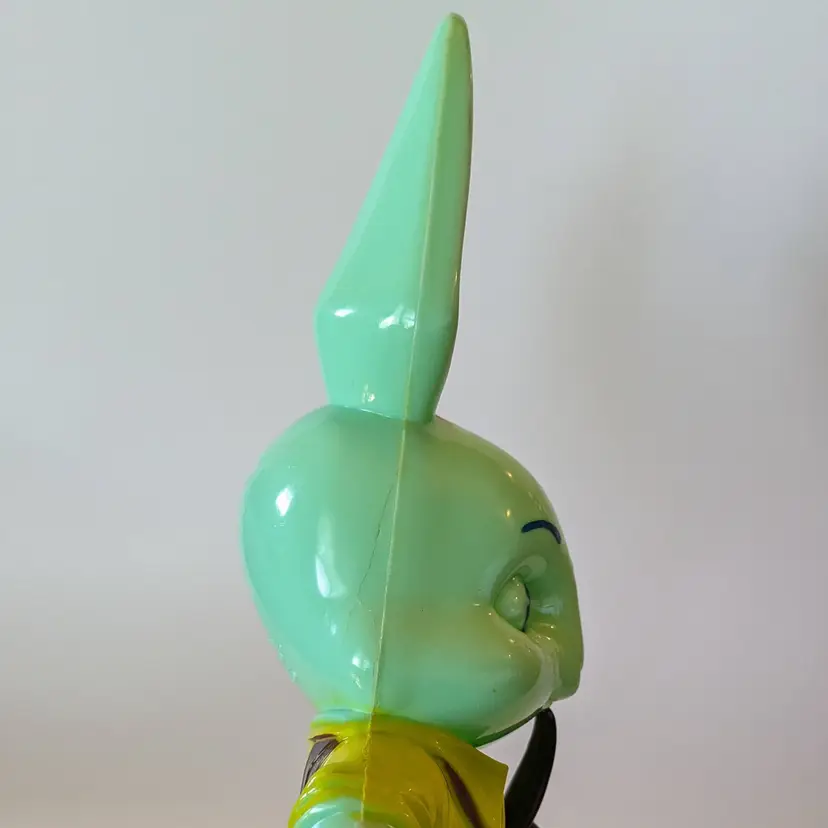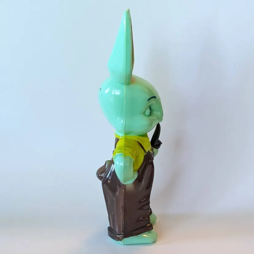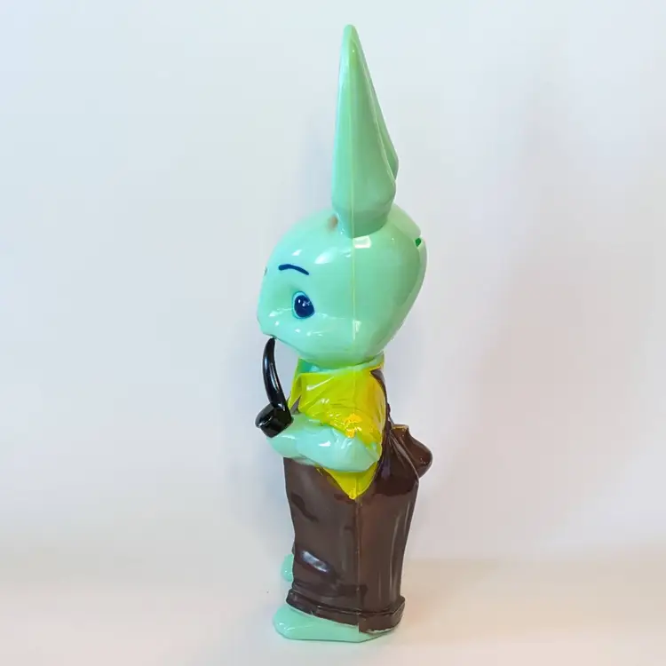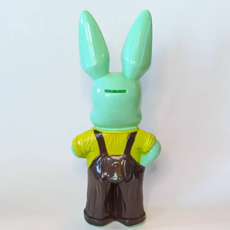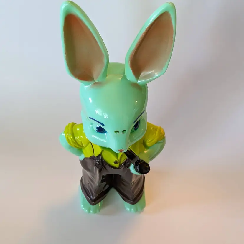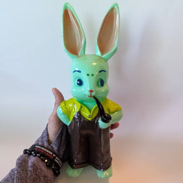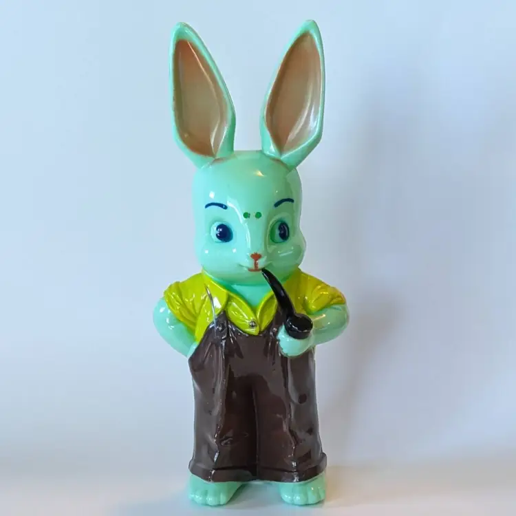 Nice Large size 1950s Knickerbocker Plastic Co. bunny rabbit with pipe, the paint is good on him only a tiny bit of wear as seen in photos he has a small hairline on the side, not noticable at all, overall he is in excellent vintage condition and hard to find in this kitschy green color way. Replacement glasses fabricated to match the original pair can be purchased on eBay for around $15, personally I think he looks better without them, showing of his super adorable face.Stopper present. Stands 11.1/2" tall, highly collectable, Great starting price on this piece!