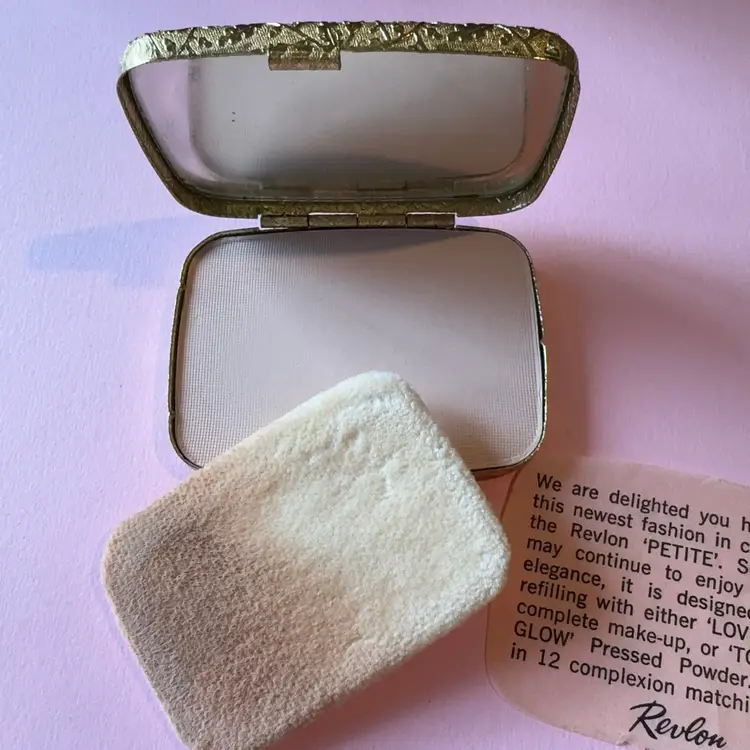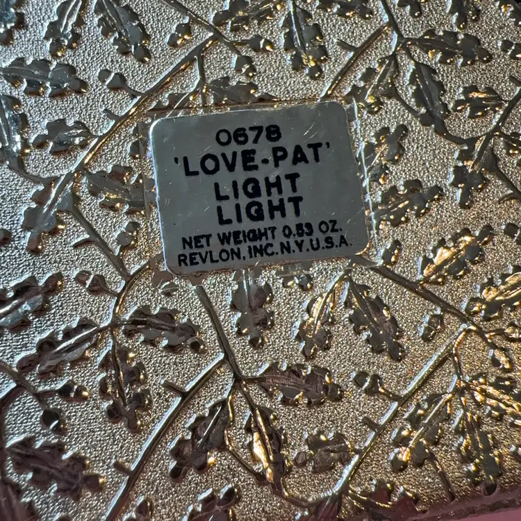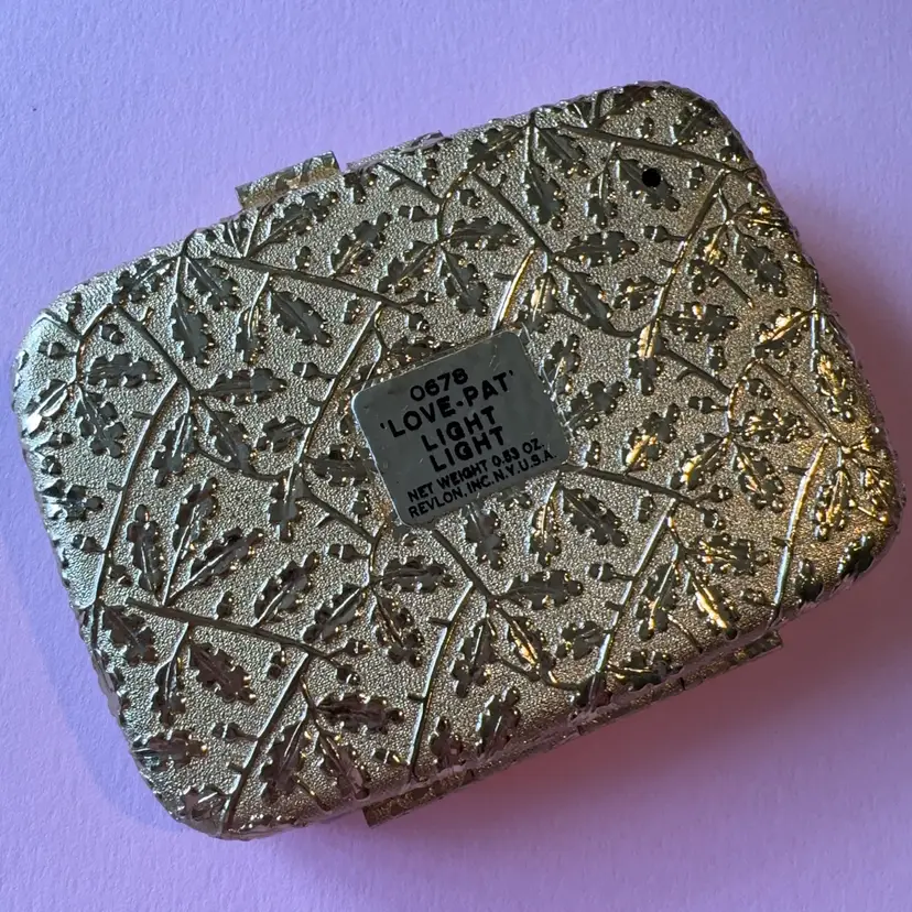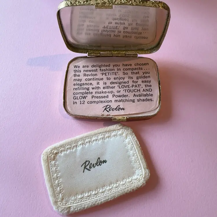 Amazing 1950s Revlon gold tone compact. Makeup is still inside. (I would not use) Compact is in perfect condition. Measures 2.5”x2”. Color is called “Love-Pat” 😬