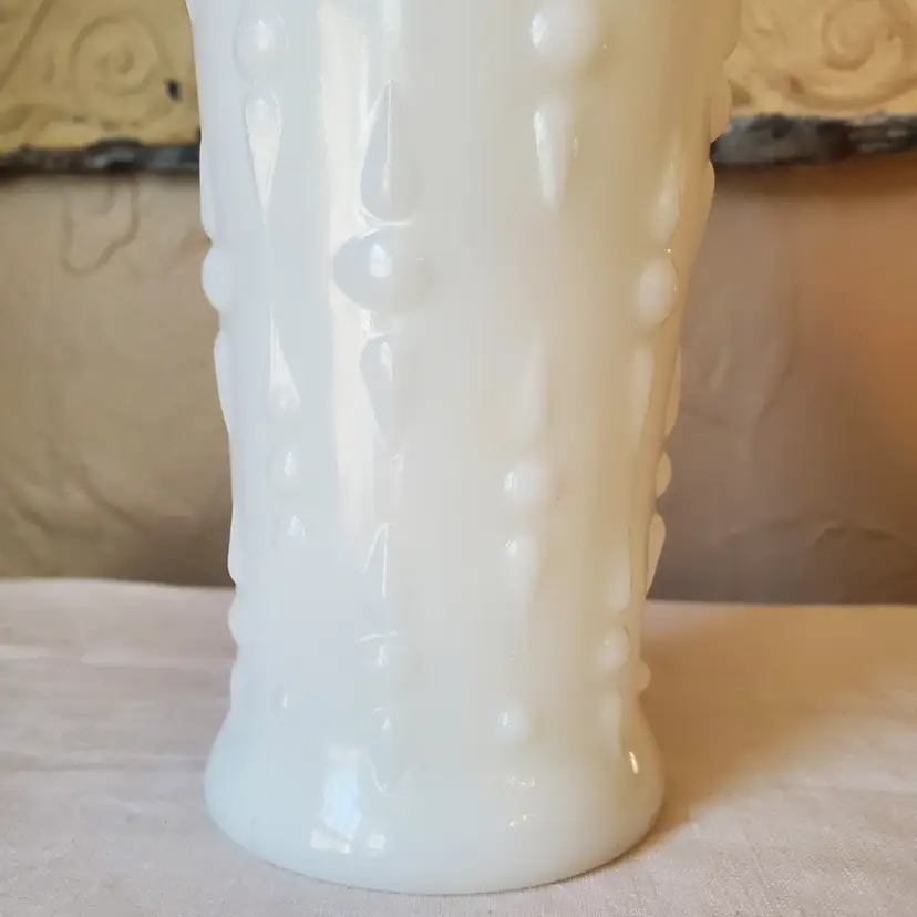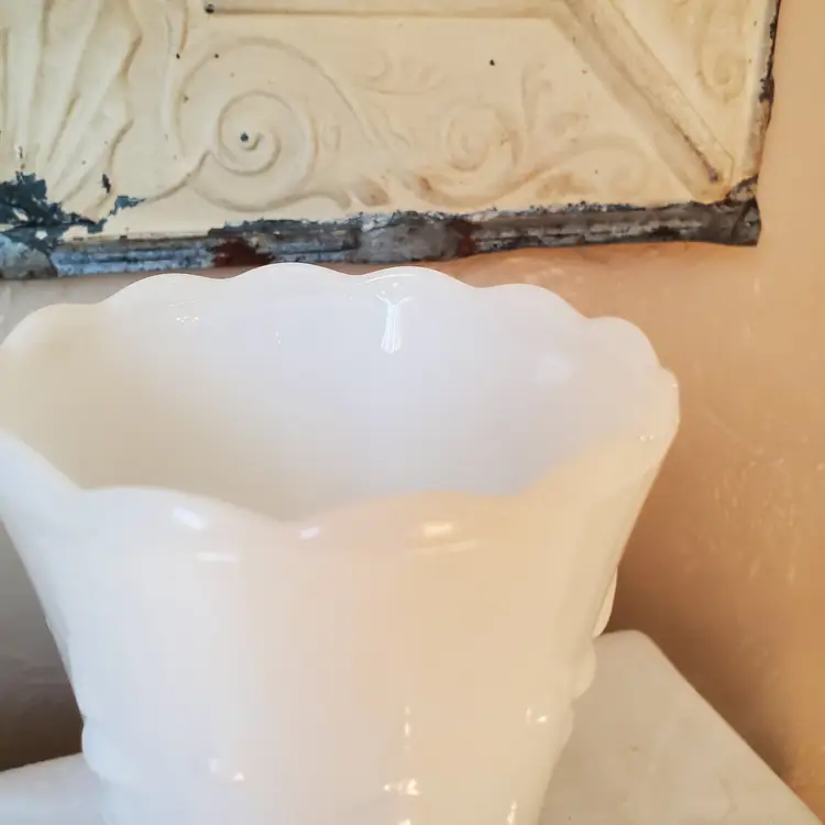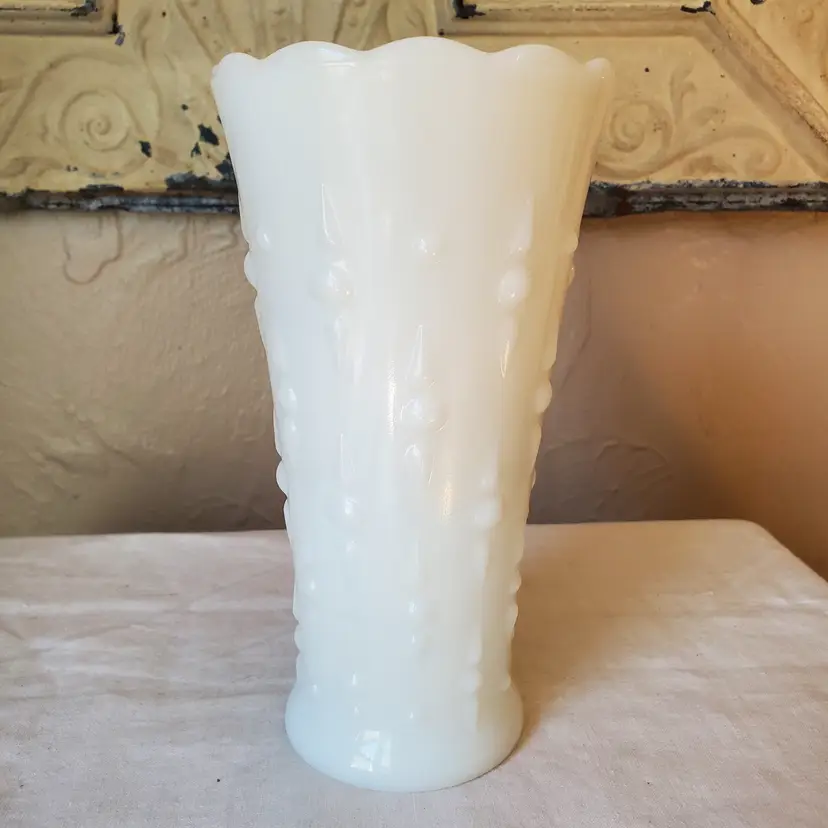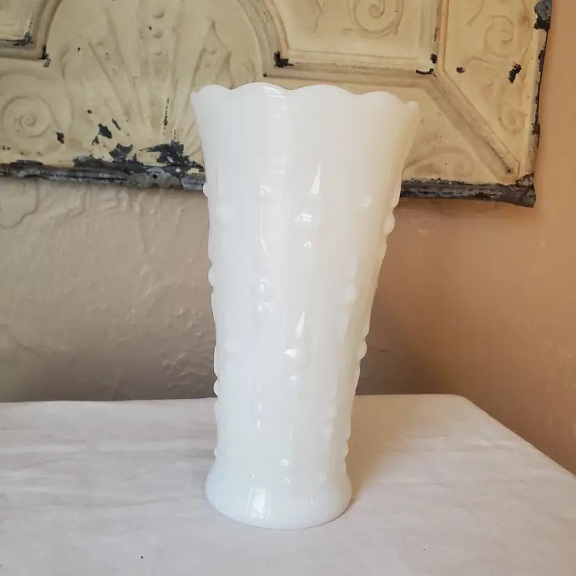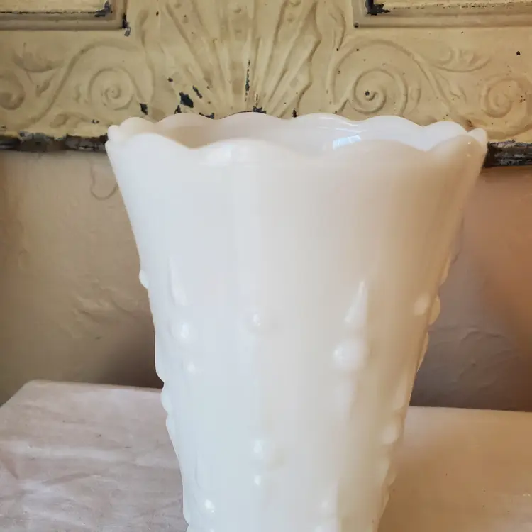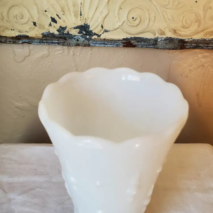 A sweet milk glass vase with a scalloped top and a pearl and dart pattern. Unbranded but most likely made by Anchor Hocking - Fire King. No chips. 7" tall.