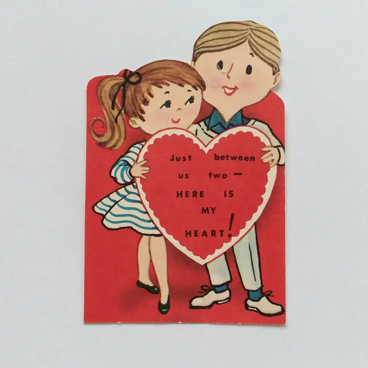 Celebrate the charm of the 1950s with this delightful vintage Valentine card featuring a cute couple holding a heart with the message 'Just between us two - HERE IS MY HEART!'. Perfect for collectors of nostalgic ephemera, this card captures the playful innocence and vibrant colors of mid-century design. A lovely addition to any collection or a heartfelt gift for someone special.