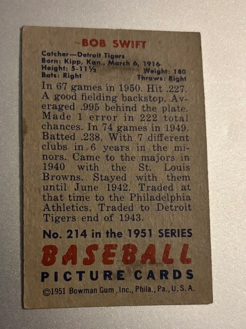 1951 Bowman #214 Bob Swift Detroit Tigers
