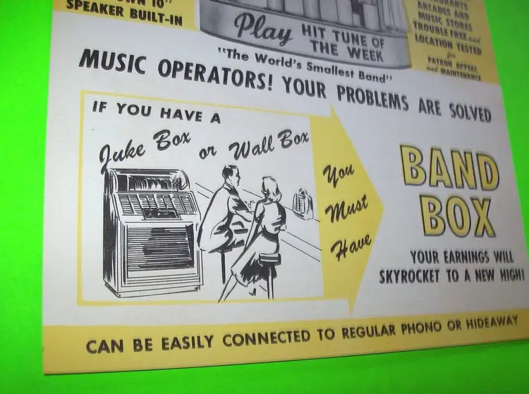 Collectors of vintage music memorabilia, jukebox ephemera, and mid-century advertising will appreciate the flyer's historic value and vivid presentation. This piece captures a niche product aimed at music venue operators, blending innovation and nostalgia in a compact promotional format.