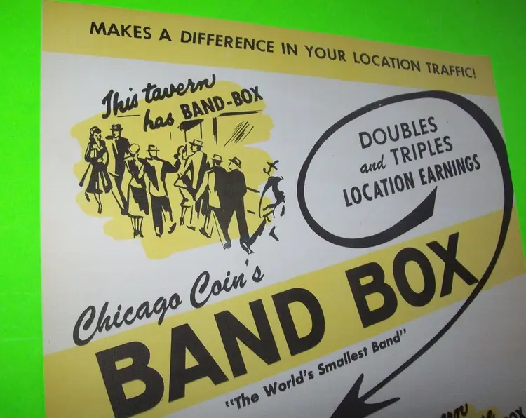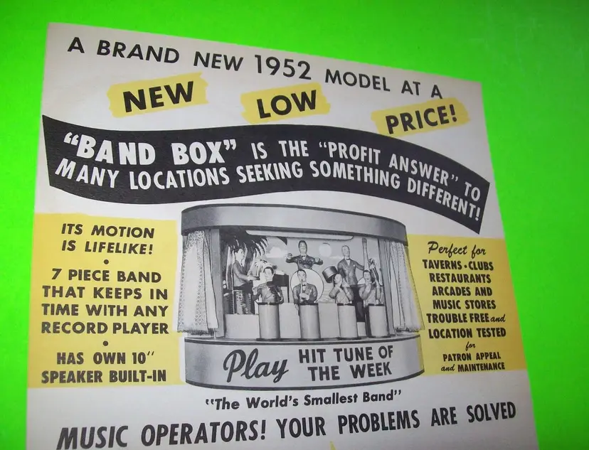 This original 1952 flyer promotes the Chicago Coin "Band Box," a unique novelty jukebox accessory described as "The World's Smallest Band." Designed to synchronize a seven-piece animated band with any record player, it includes a built-in 10" speaker and promises to boost earnings for taverns, clubs, restaurants, arcades, and music stores. The flyer highlights the Band Box's lifelike motion and easy connection to standard phonographs or hideaways, making it a standout marketing piece from the early 1950s entertainment industry.
