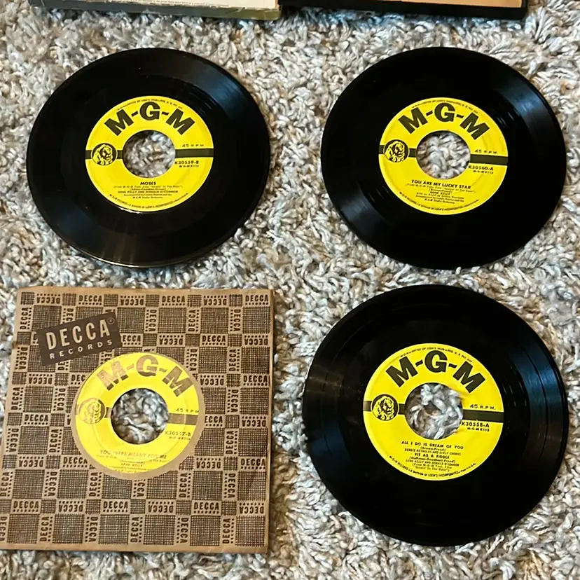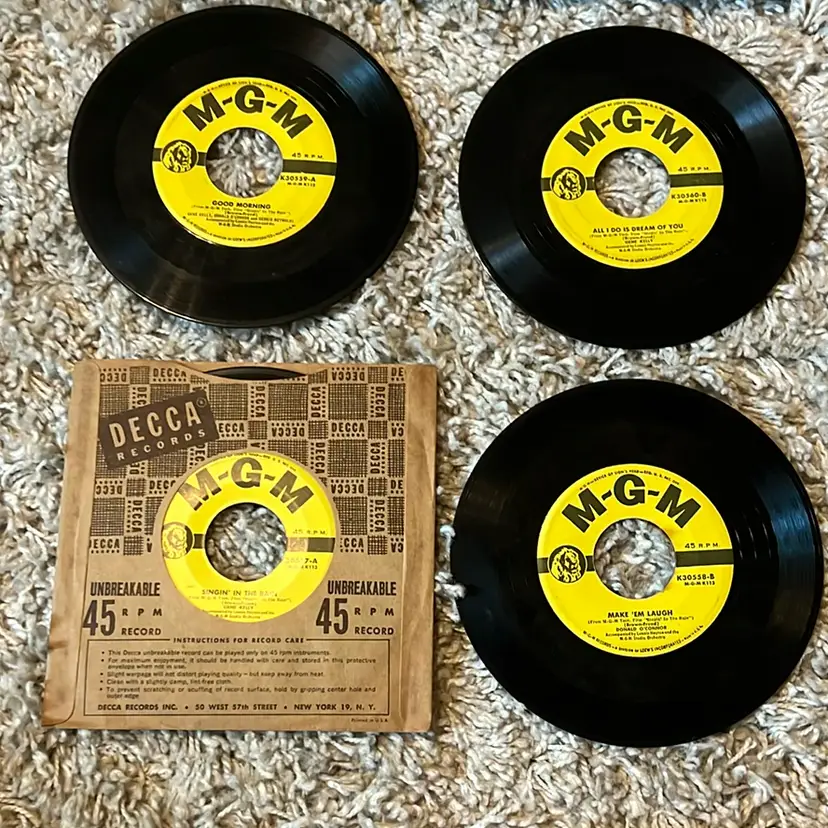 Four records included. Songs included are …. You were meant for me. You are my lucky star. Make them laugh. Singing in the rain. Moses. Fit as a fiddle. All I do is dream of you. Good morning.
