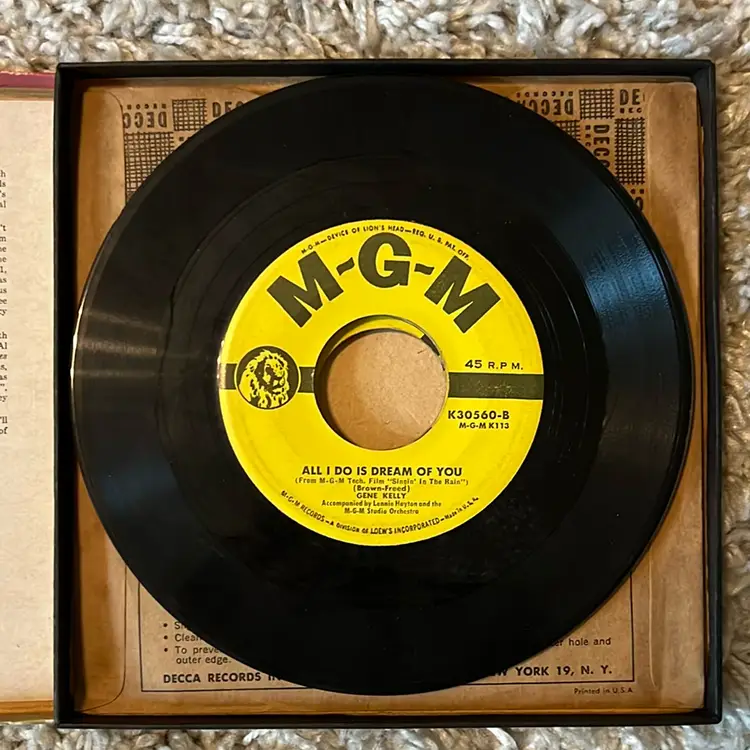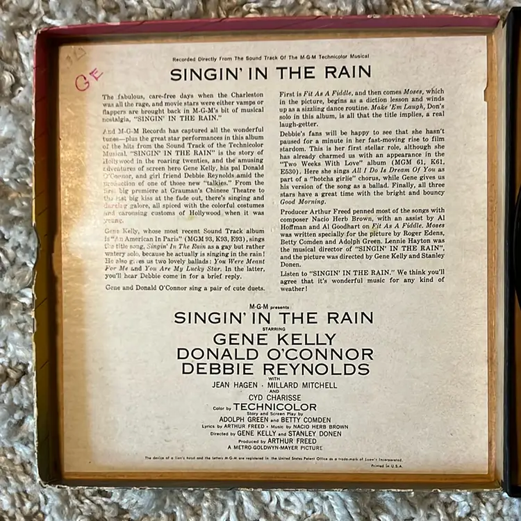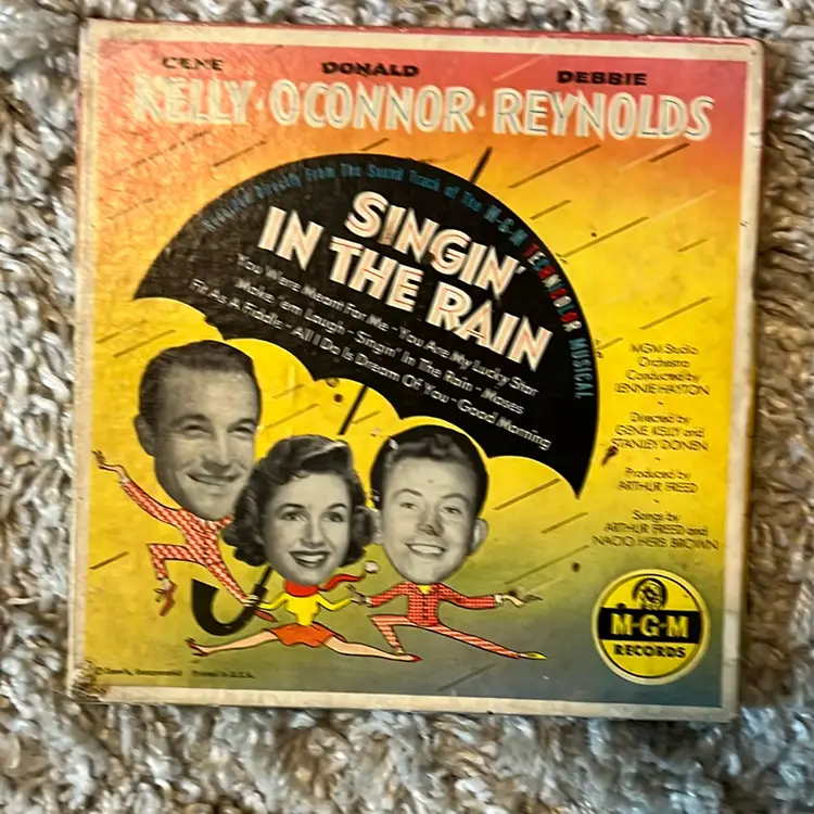 Gene Kelly, Donald O’Connor and Debbie Reynolds can be heard from the musical singing in the rain on the songs. Recorded directly from the musical. Super hard to find a set like this great for any vintage music lover.