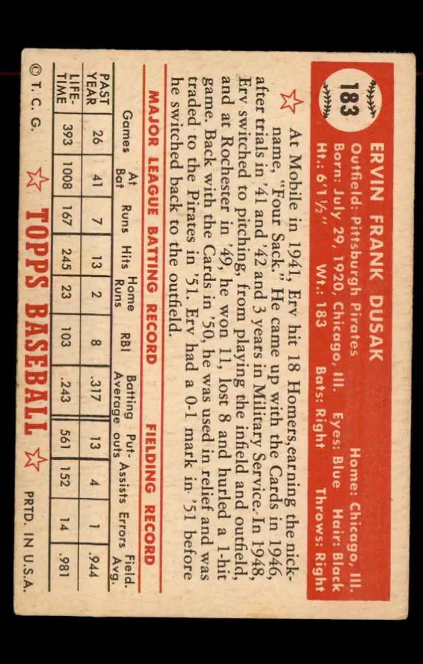 1952 Topps #183 Erv Dusak - (pk-tl1) - Pittsburgh Pirates