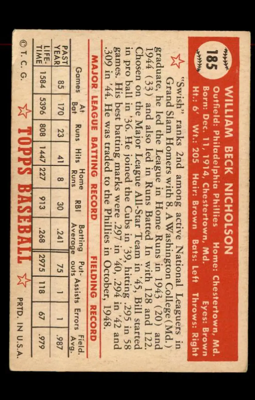 1952 Topps #185 Bill Nicholson - (pk-tl1) - Philadelphia Phillies
