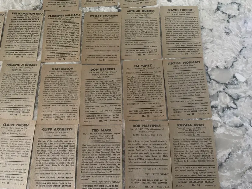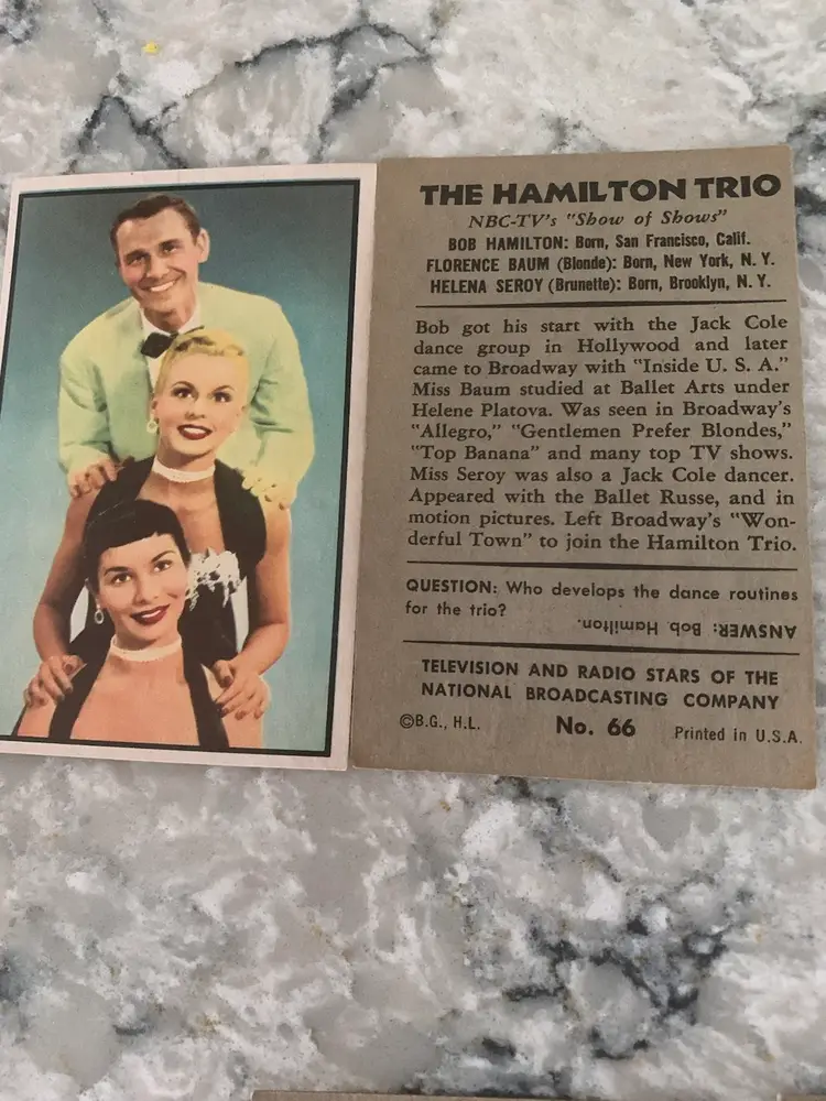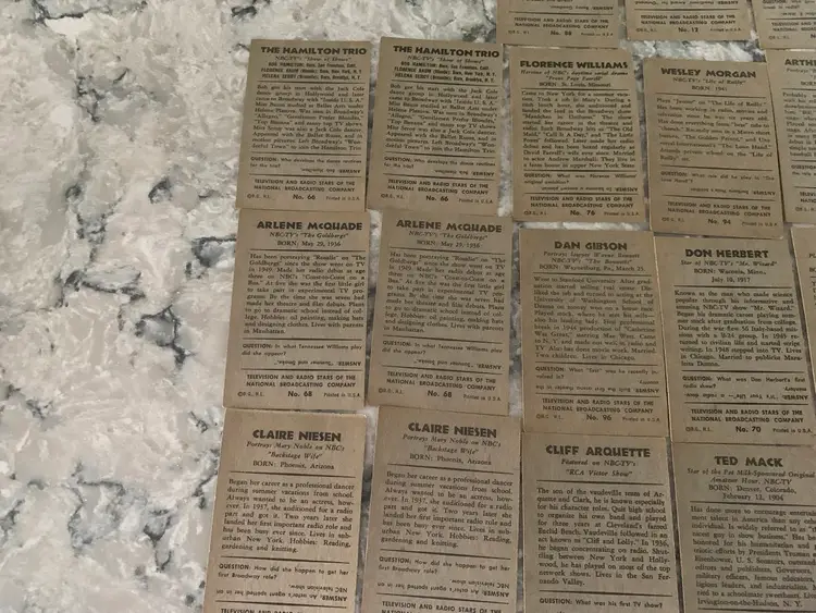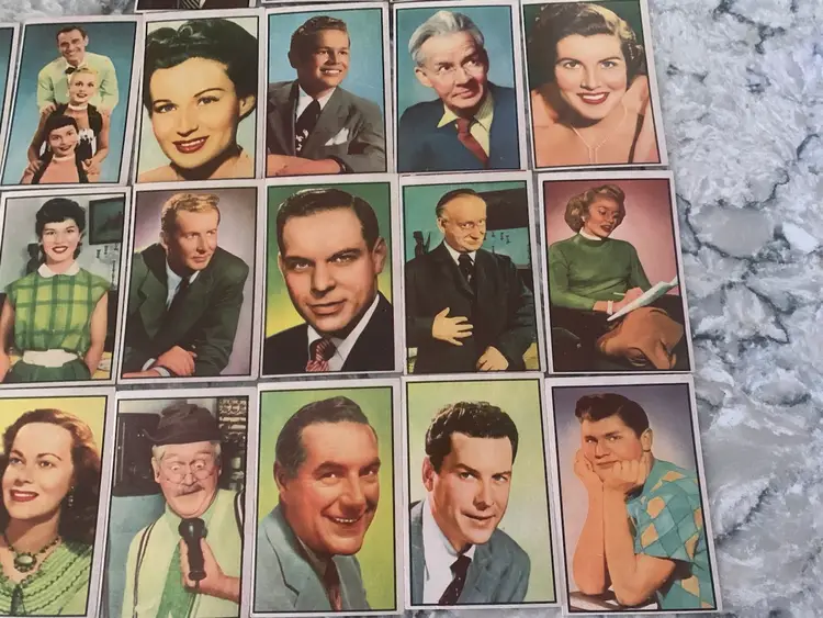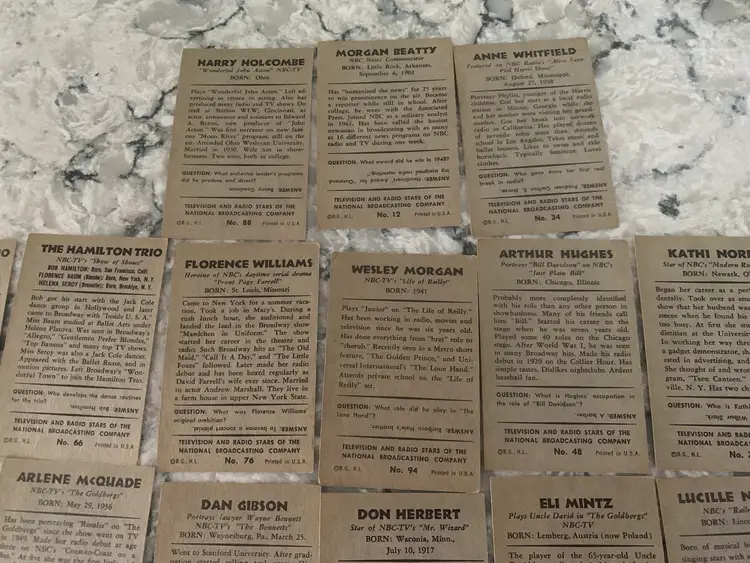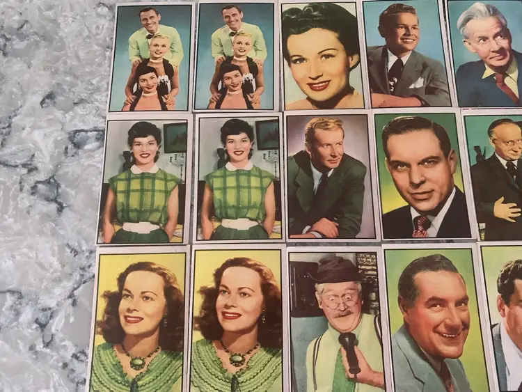 21 1953 Bowman Cards (3) Duplicates Of TV &Radio Stars from NBC. Hamilton Trio Dupe Card Features Florence Baum, Mel Brooks 1st Wife, Newsman Morgan Beatty, Wesley Morgan from Life of Reilly and many More. Some have Creases. Overall Good Shape.