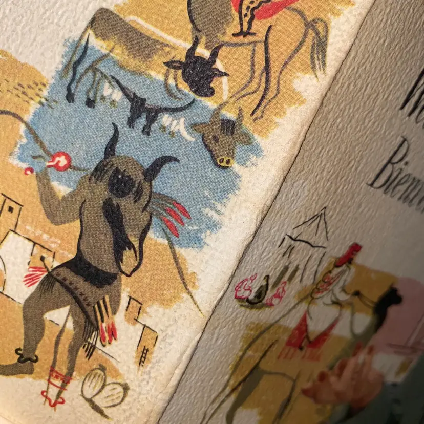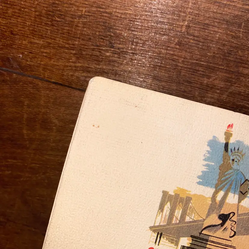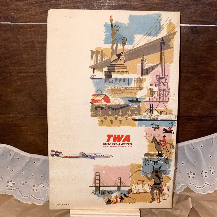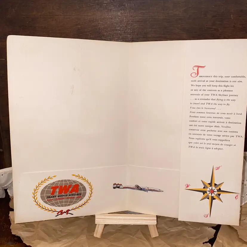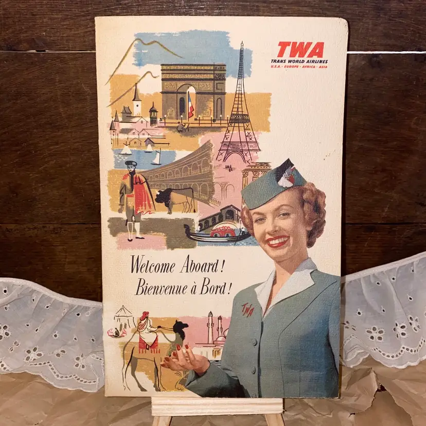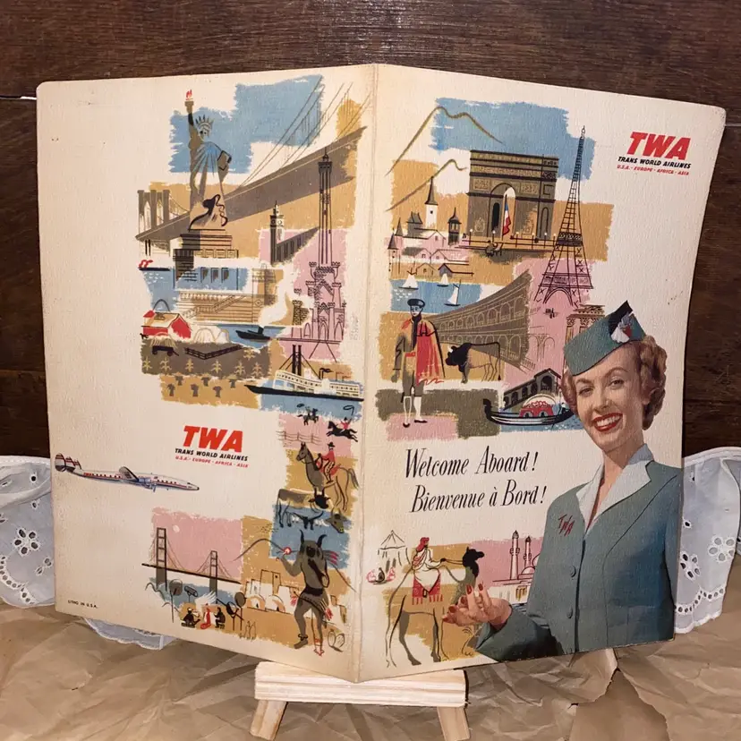 •1954 Trans World Airlines “Welcome Aboard” booklet sleeve (empty) with amazing mid century graphics •10.5” x 6.5” •conditional notes: spine has some splitting, and there are a few very small stains to surface (all pictured)