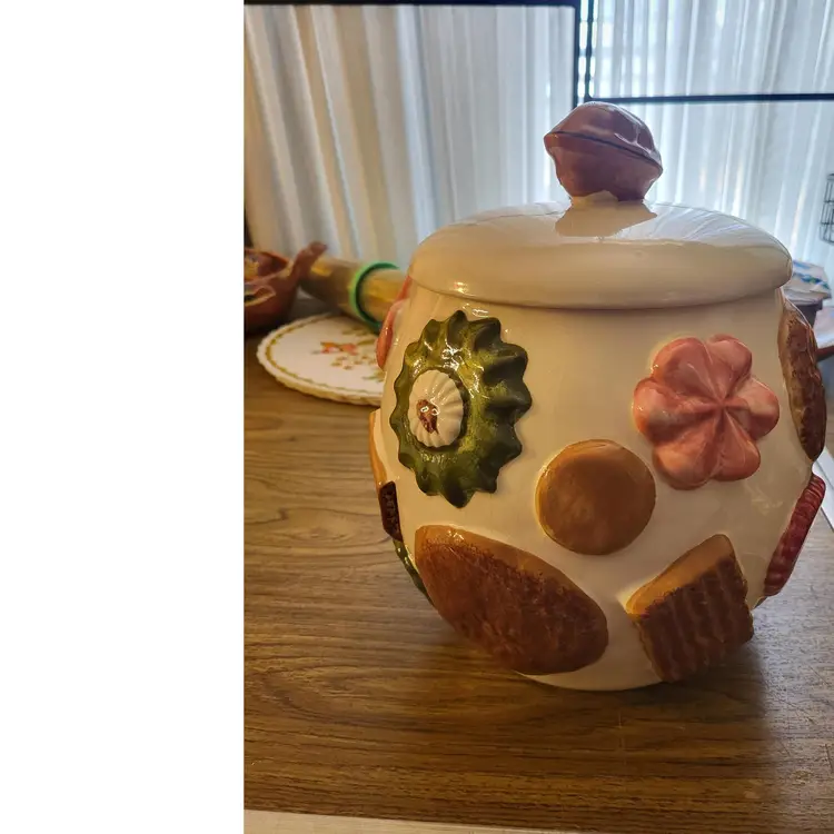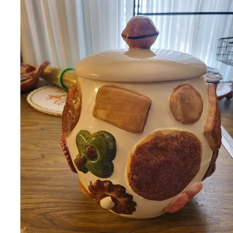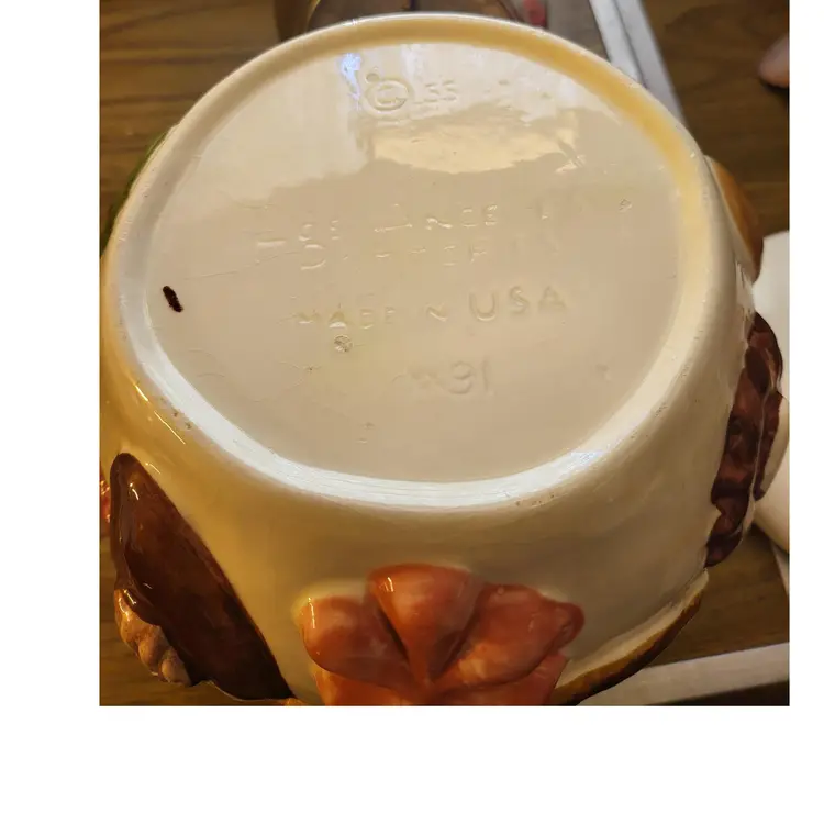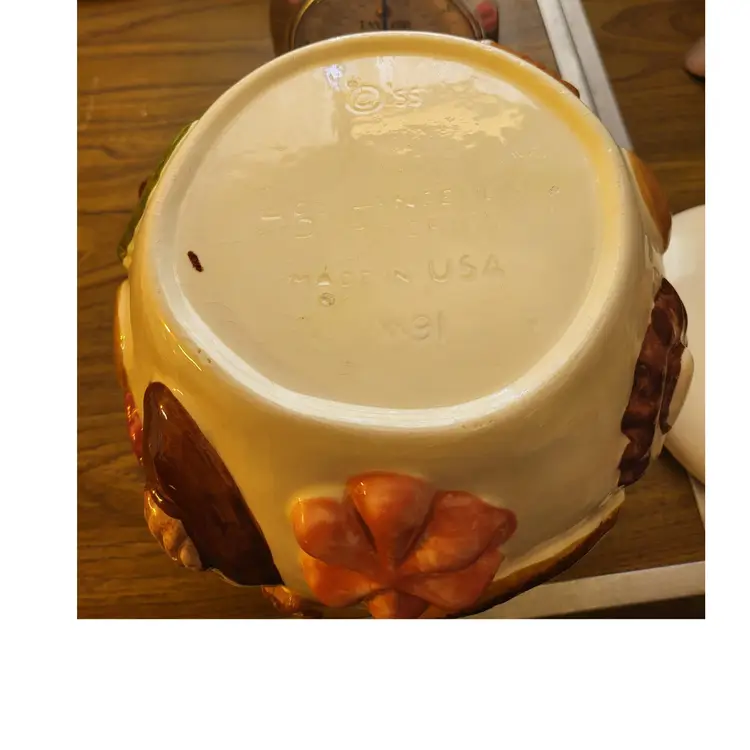With walnut finial. Measures 9 1/2" tall x 8" wide. There is crazing throughout. No chips or cracks. Found while thrifting in Ohio.