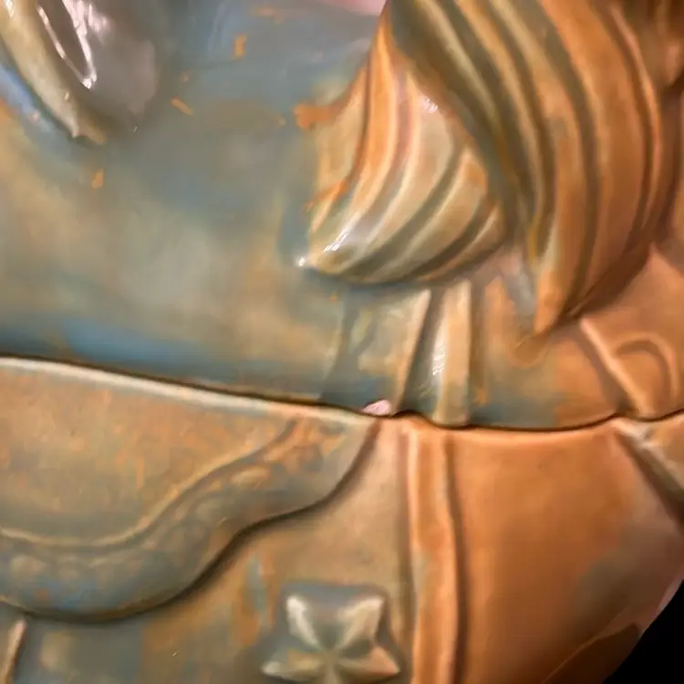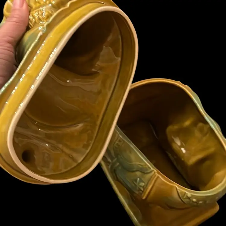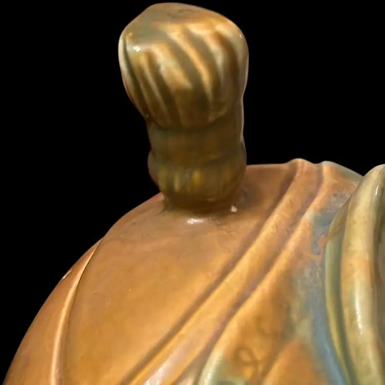 Alberta's Pottery was a ceramics company known for producing decorative and functional items, including cookie jars, during the mid-20th century. Based in California, their pieces often featured hand-painted details or molded designs, and many have become sought-after collectibles. Although they made made reproductions, they made only two colorways on the first run and this is one of them.