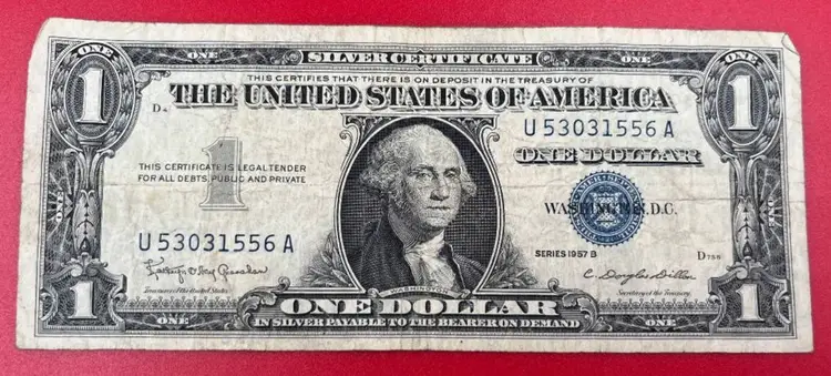 Hello, what we have is a One Dollar Bill Graded by us as Average Circulated. Year: 1957-B. Type: Silver Certificate. Number: U53031556A