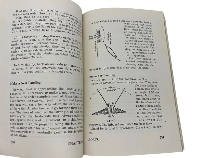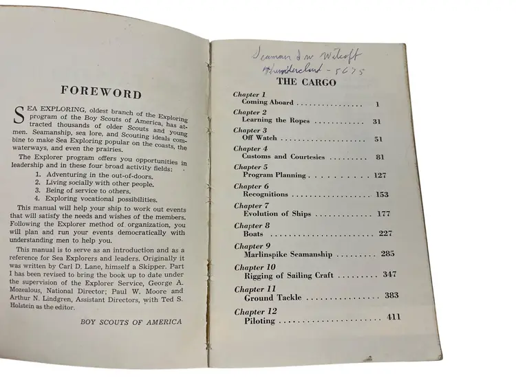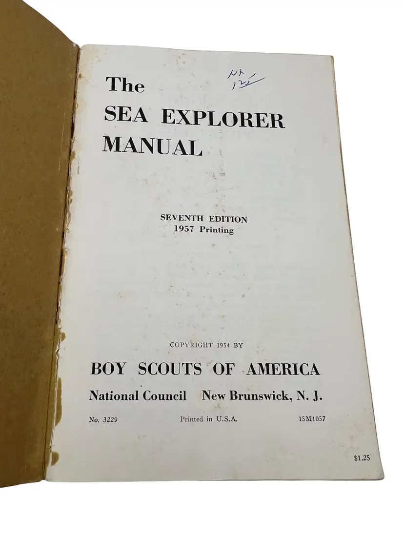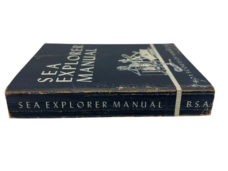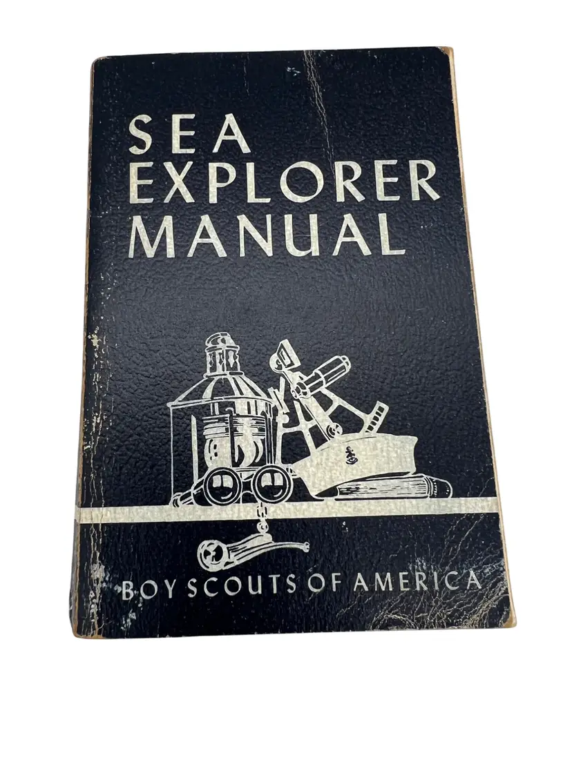 Vintage Sea Explorer Manual, Seventh Edition (1957 printing), issued by the Boy Scouts of America for the Sea Exploring program. Softcover reference book with 640 pages covering seamanship, navigation, marlinspike seamanship, rigging, cruising, customs and courtesies, galley work, safety, and ship evolution. Includes diagrams, illustrations, and practical instructions used for maritime training in the BSA’s mid-century Exploring program. A solid example of 1950s Boy Scouts nautical history and a great resource for Sea Scouts collectors or maritime enthusiasts.