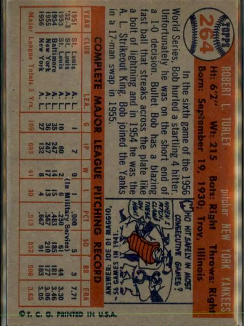1957 Topps #264 Bob Turley - ( pk1 ) - New York Yankees