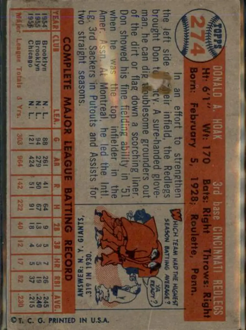 1957 Topps #274 Don Hoak - ( pk1 ) - Cincinnati Redlegs