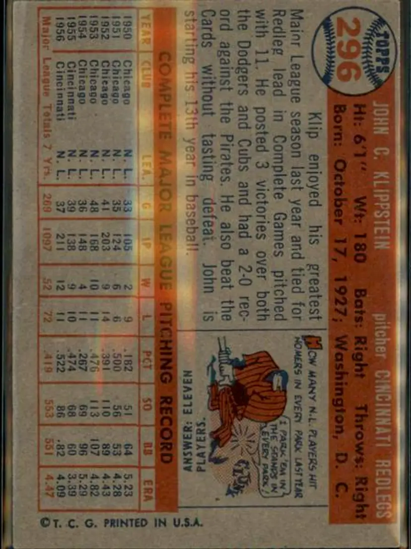 1957 Topps #296 Johnny Klippstein - ( pk1 ) - Cincinnati Redlegs