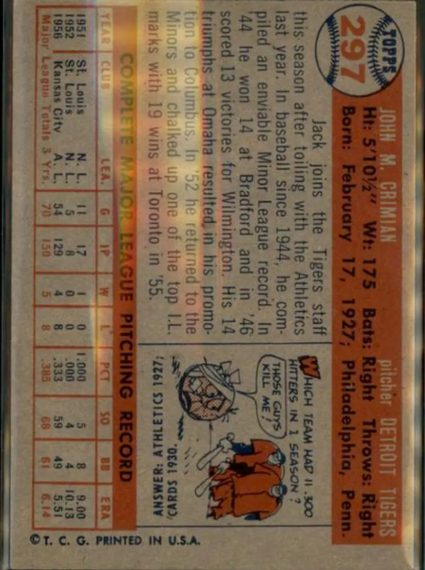 1957 Topps #297 Jack Crimian - ( pk1 ) - Detroit Tigers