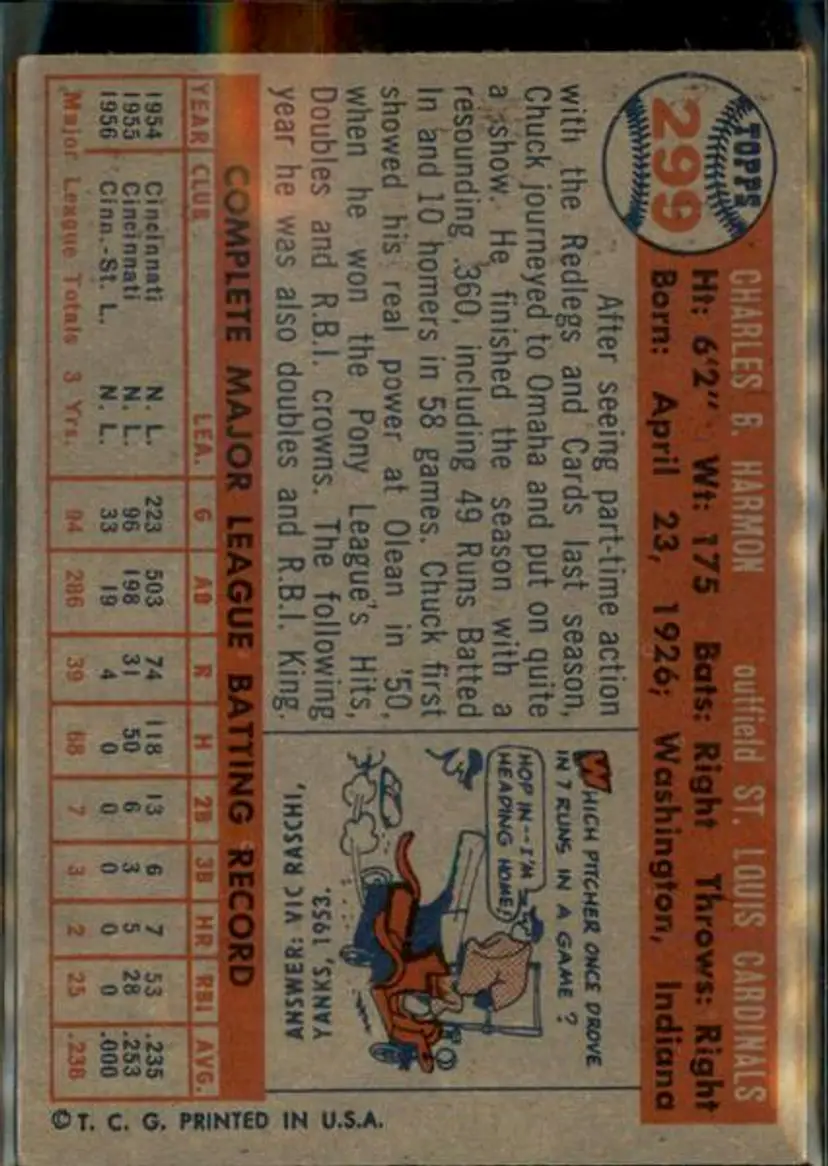 1957 Topps #299 Chuck Harmon - ( pk1 ) - St. Louis Cardinals