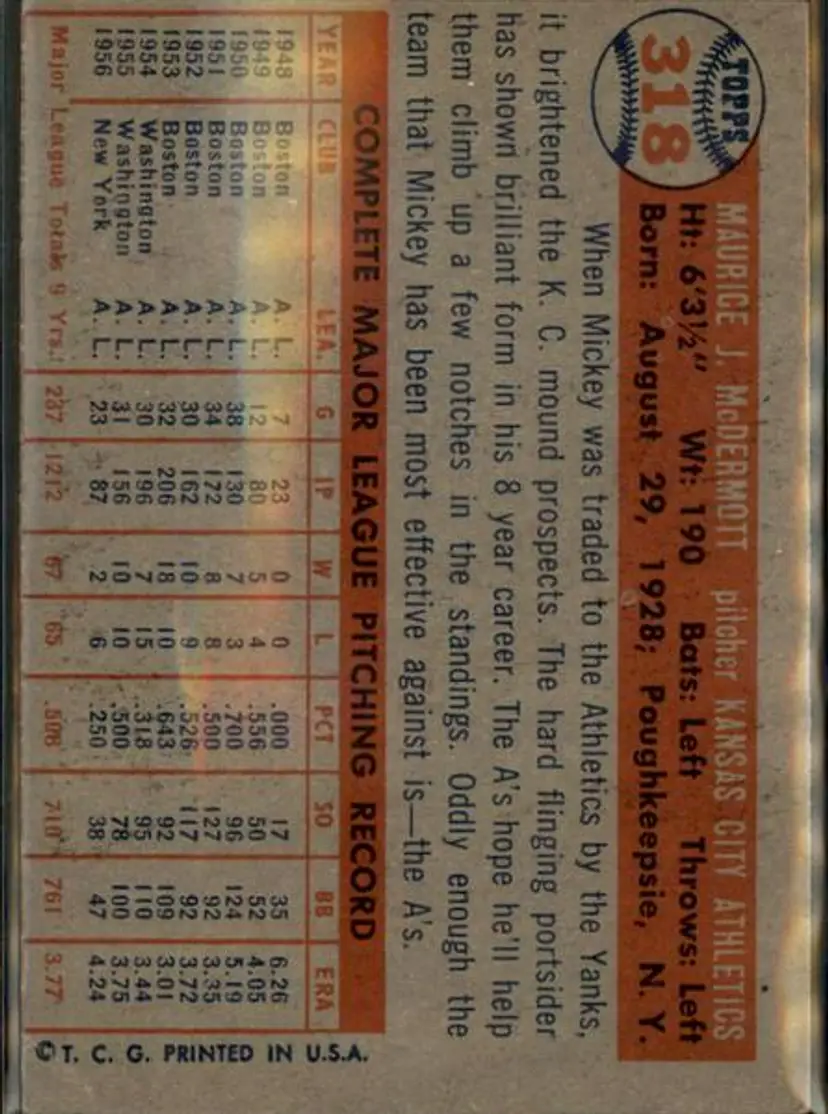 1957 Topps #318 Mickey McDermott - ( pk1 ) - Kansas City Athletics