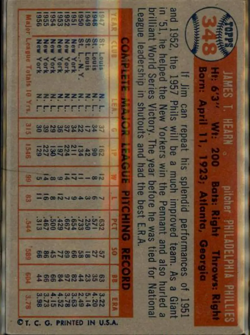 1957 Topps #348 Jim Hearn - ( pk1 ) - Philadelphia Phillies