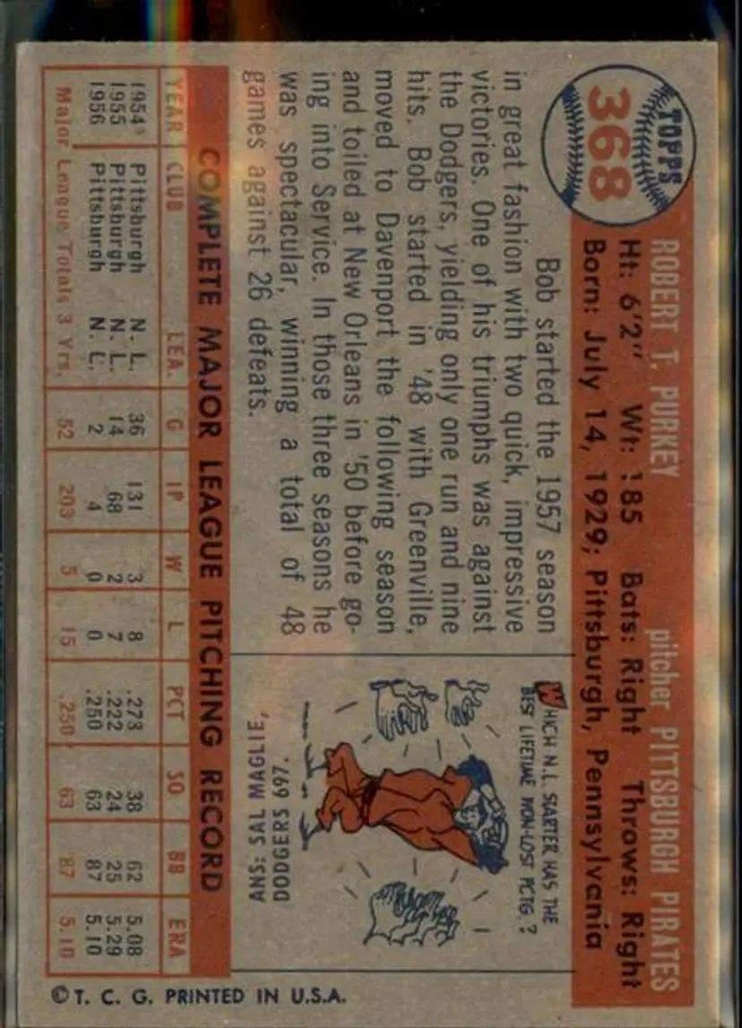 1957 Topps #368 Bob Purkey - ( pk1 ) - Pittsburgh Pirates
