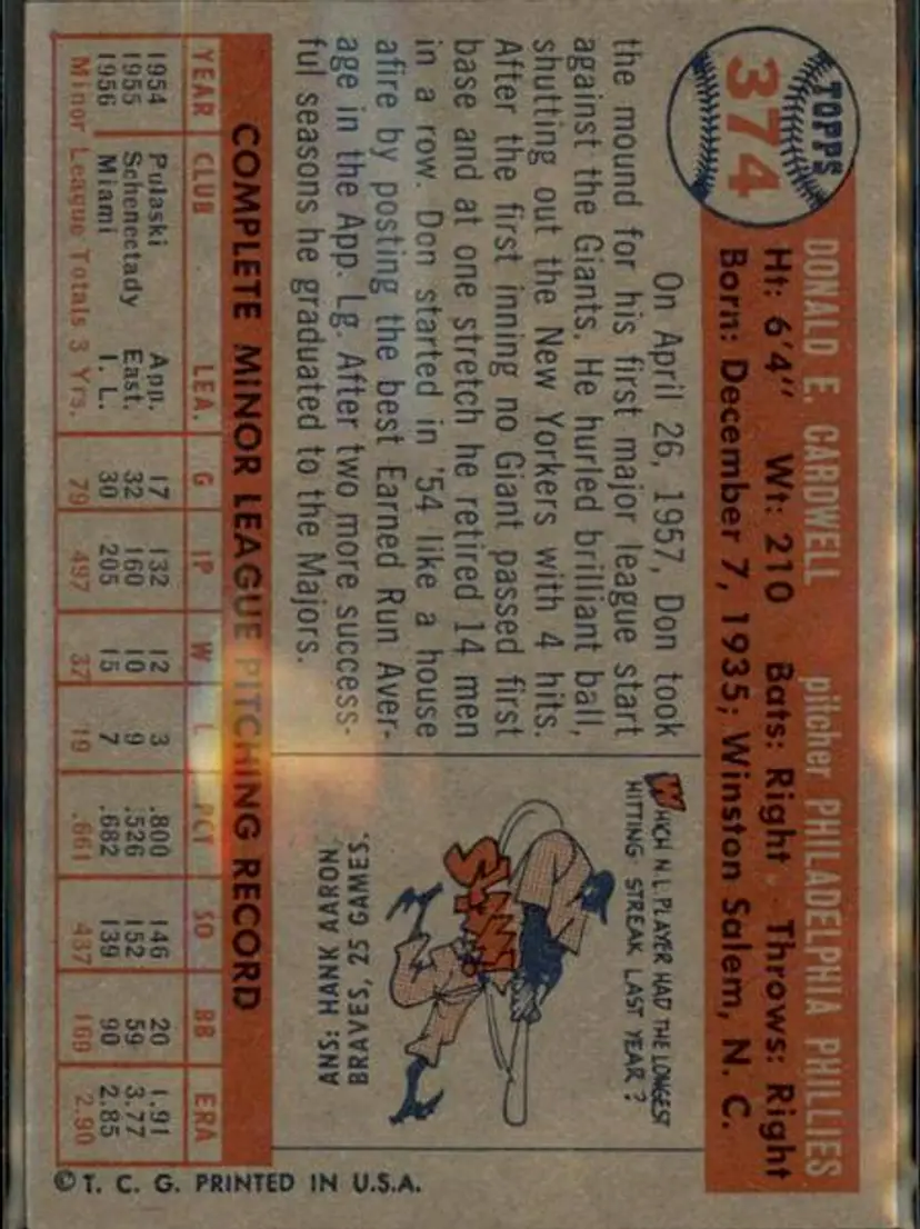 1957 Topps #374 Don Cardwell - ( pk1 ) - Philadelphia Phillies