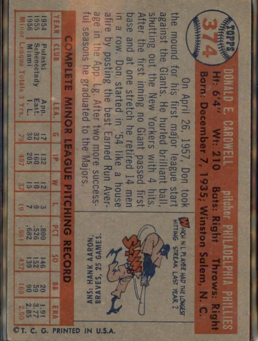 1957 Topps #374 Don Cardwell - (pk1) - Philadelphia Phillies