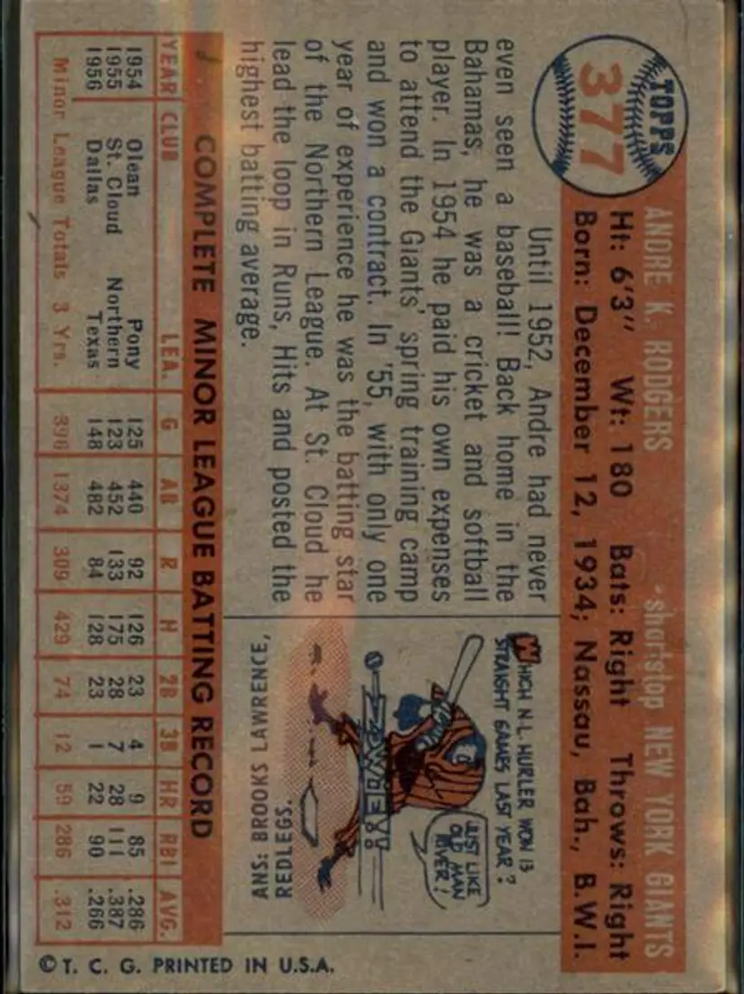 1957 Topps #377 Andre Rodgers - ( pk1 ) - New York Giants