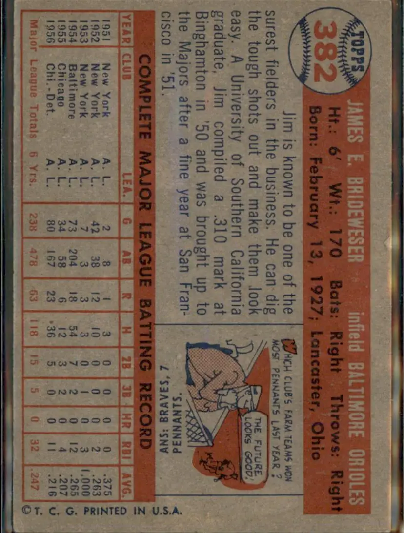 1957 Topps #382 Jim Brideweser - (pk1) - Baltimore Orioles