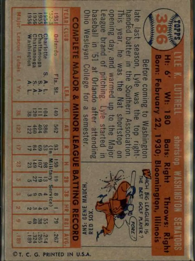 1957 Topps #386 Lyle Luttrell - ( pk1 ) - Washington Senators