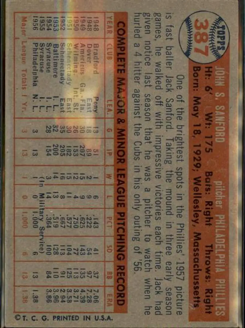 1957 Topps #387 Jack Sanford - ( pk1 ) - Philadelphia Phillies