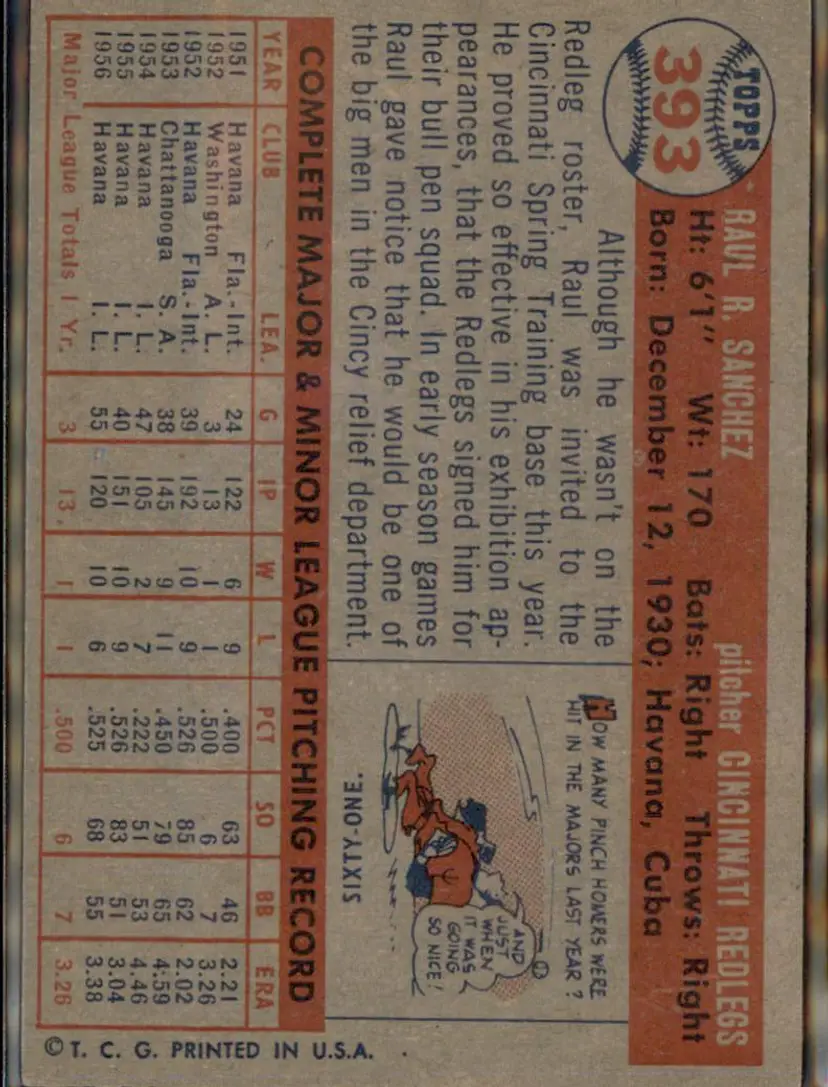 1957 Topps #393 Raul Sanchez - (pk1) - Cincinnati Redlegs