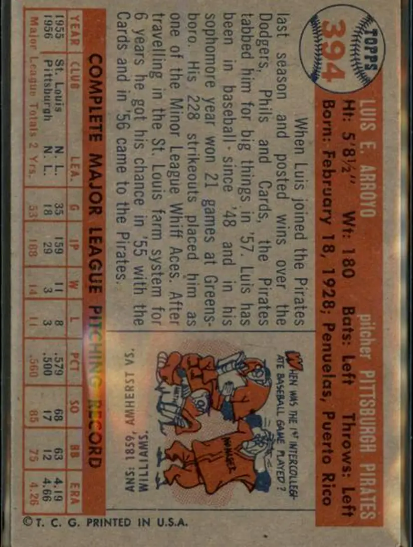 1957 Topps #394 Luis Arroyo - ( pk1 ) - Pittsburgh Pirates